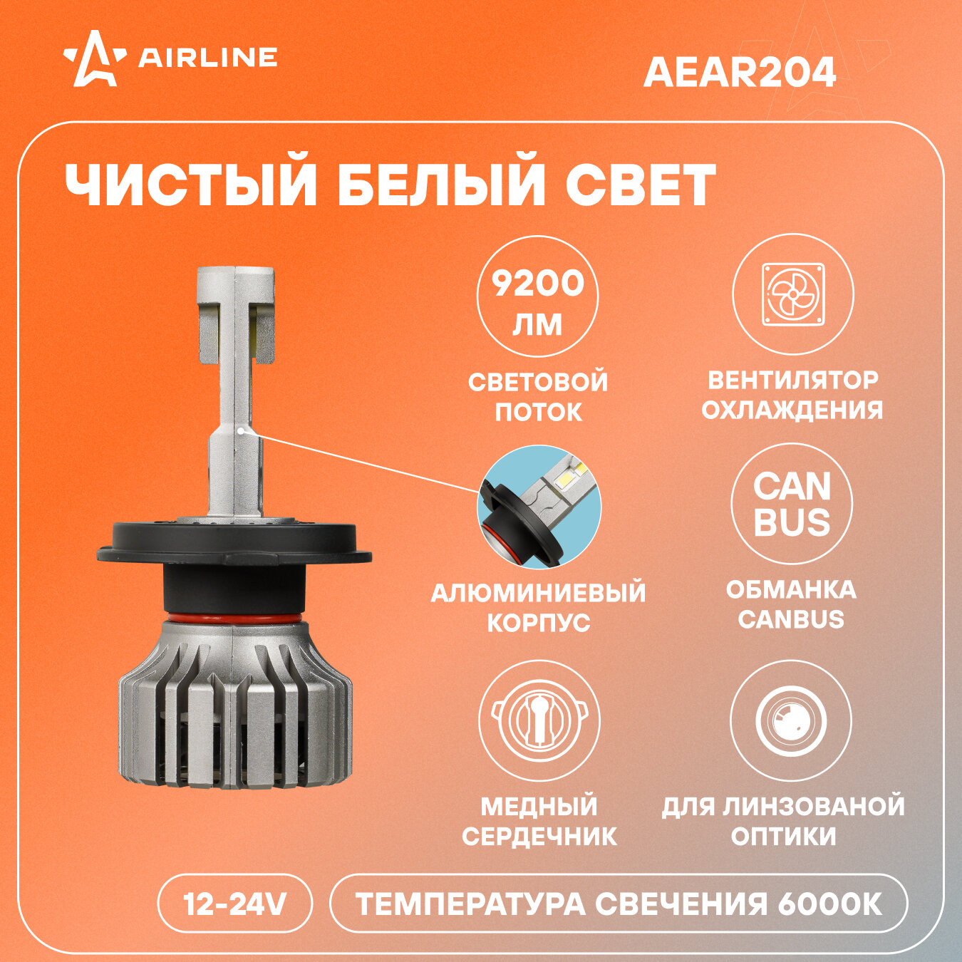 Лампа светодиодная, H4, 50Вт, 9200Лм (4600Лм x 2), 6000К (Белый), 12/24В, для рефлекторной/линзованной оптики, комплект 2 шт, PRO AEAR204 AIRLINE информация: