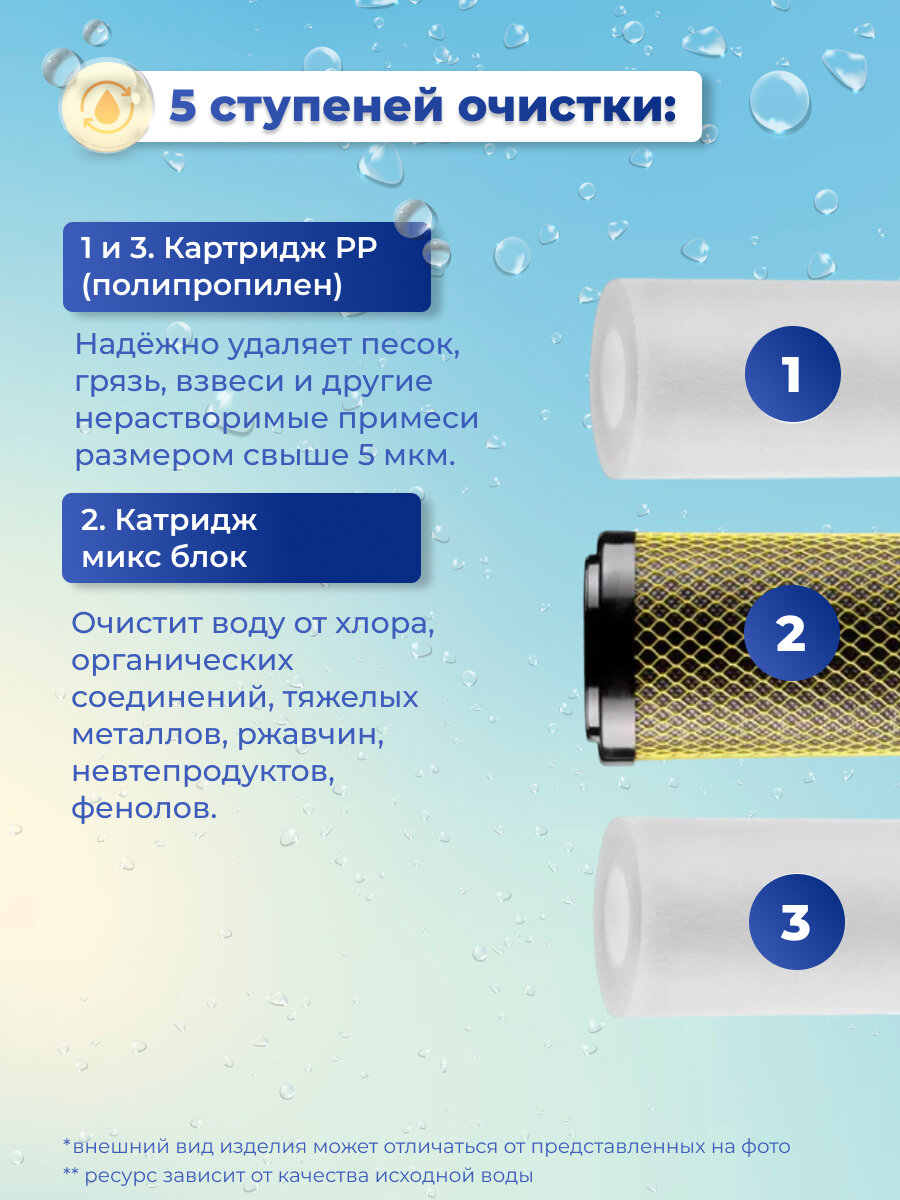 | Дополнительная информация | для мягкой воды; защита от вирусов и бактерий; дозатор кальция; картриджи в комплекте - осадочный, Арагон М-БИО+В(Са), CBC Ag/ММВ; макс. температура воды на входе: 40 °C; мин. температура воды на входе: 4 °C; мин. давление на входе: 0.5 атм; макс. давление на входе: 7 атм; рекомендуемая производительность: 3 л/мин |