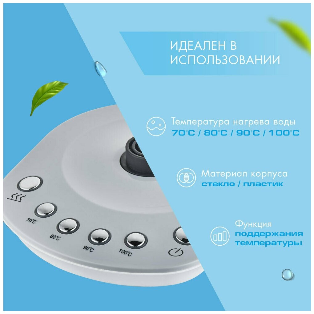 | Дополнительная информация | контейнер-ситечко для заварки чая внутри чайника, кнопочная панель управления, эргономичная ненагревающаяся ручка, автоотключение при закипании, два типа стенок для предотвращения контакта с горячей поверхностью |