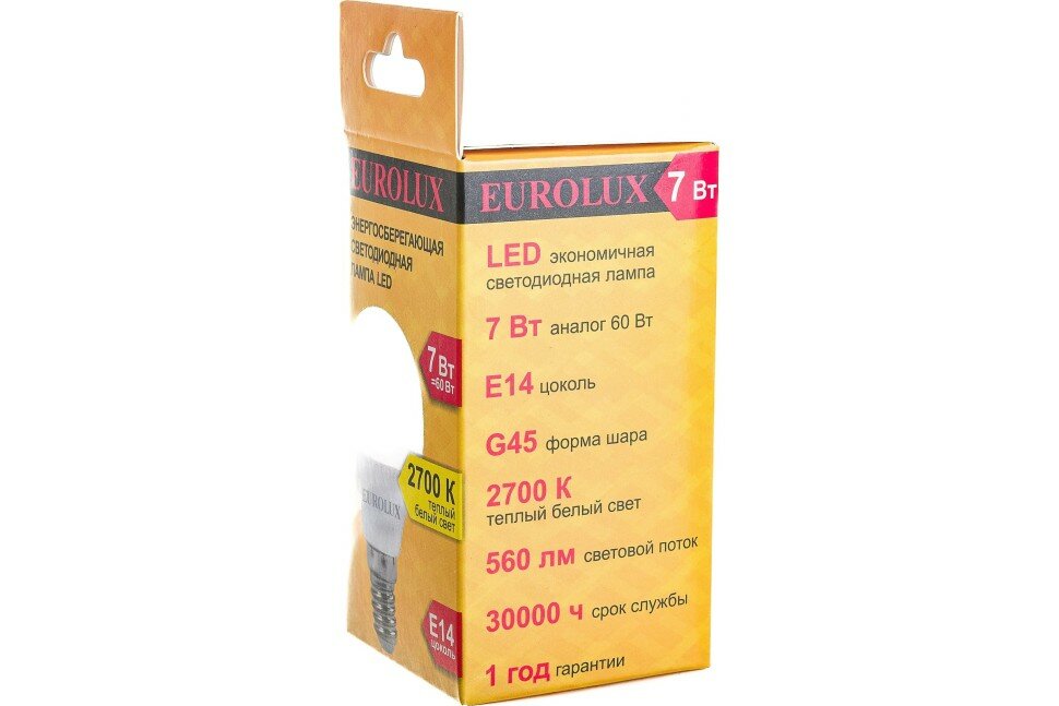 Лампа светодиодная LL-E-G45-7W-230-2,7K-E14 (шар, 7Вт, тепл, Е14) Eurolux информация: