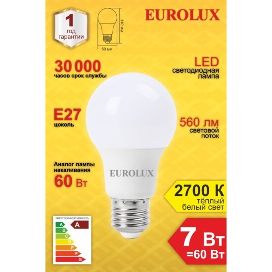 Отзывы на Светодиодная лампа Eurolux LL-E-A60-7W-230-2,7K-E27 (груша, 7Вт, тепл, Е27), 76/2/11