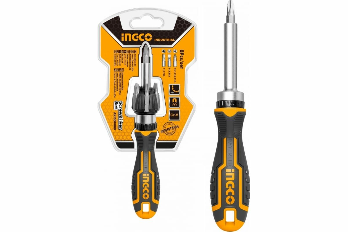 Отвёрткa тpeщоточная с битами INGCO AKISD0808 INDUSTRIAL 8 шт.