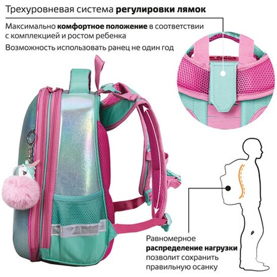 Ранец BRAUBERG SHINY, 2 отделения, с брелком, "Magic unicorn", 38х28х14 см