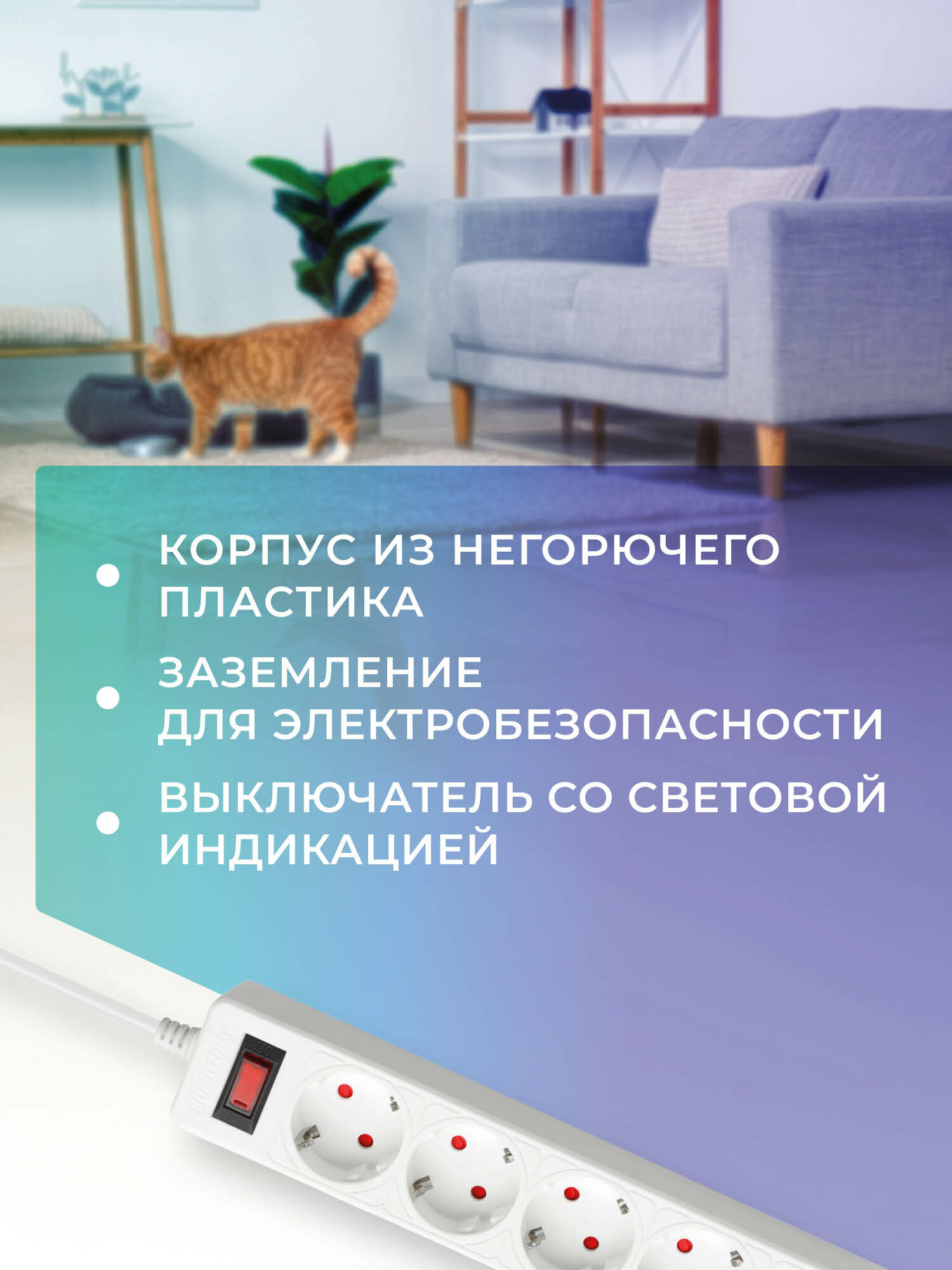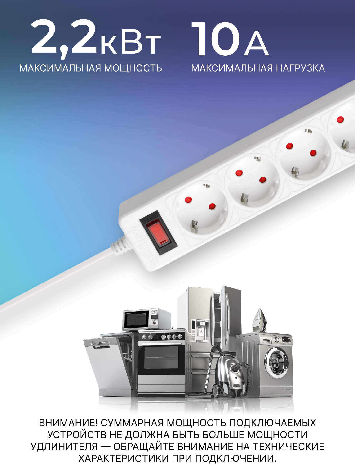 Сетевой фильтр SmartBuy, 10А, 2 200 Вт, 5 розеток, длина 5,0 м, белый, Smartbuy информация: