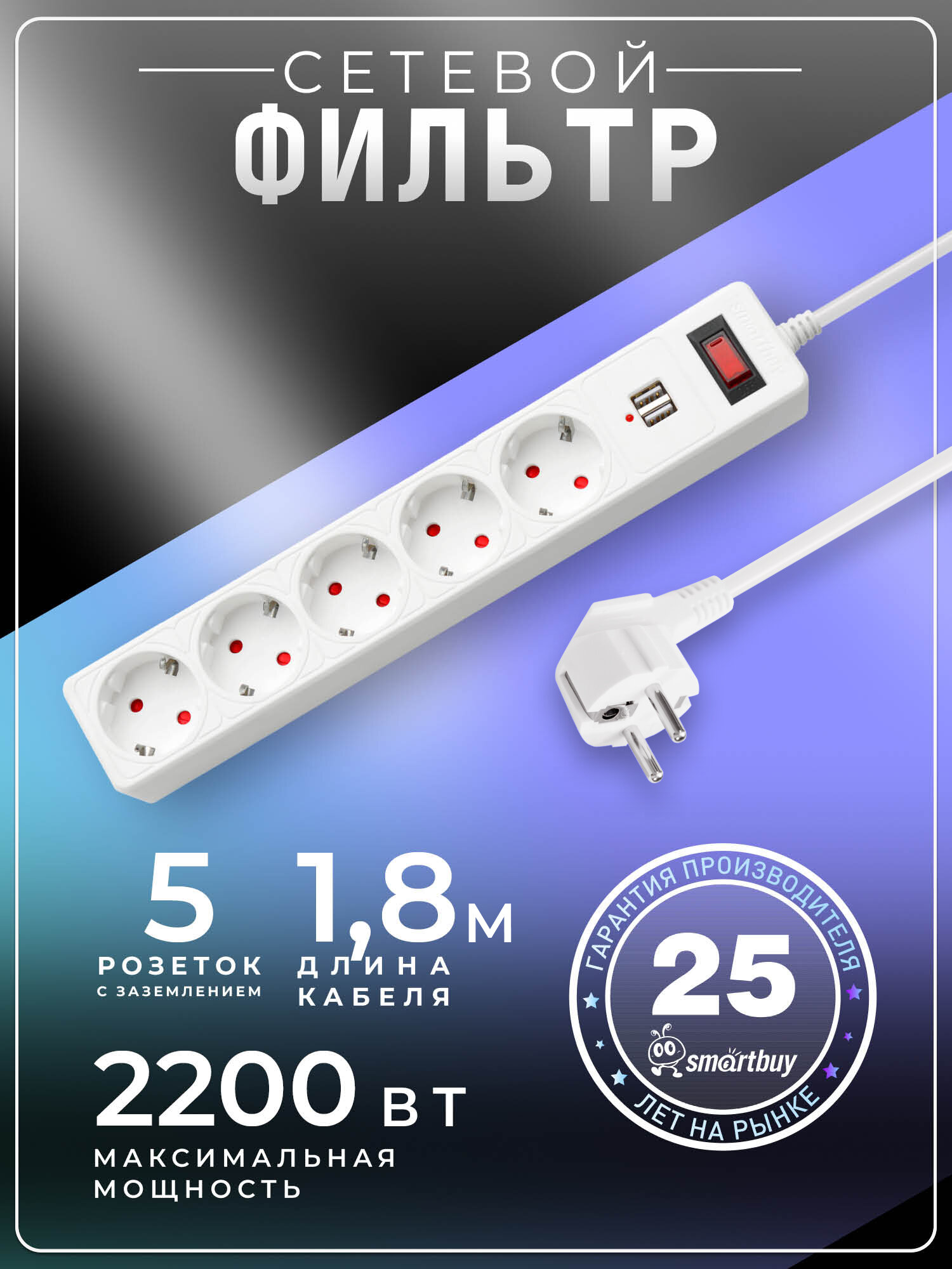 Отзывы на Сетевой фильтр SmartBuy с USB, 10А, 2200 Вт, 5 розеток, длина 1,8 м, белый, Smartbuy