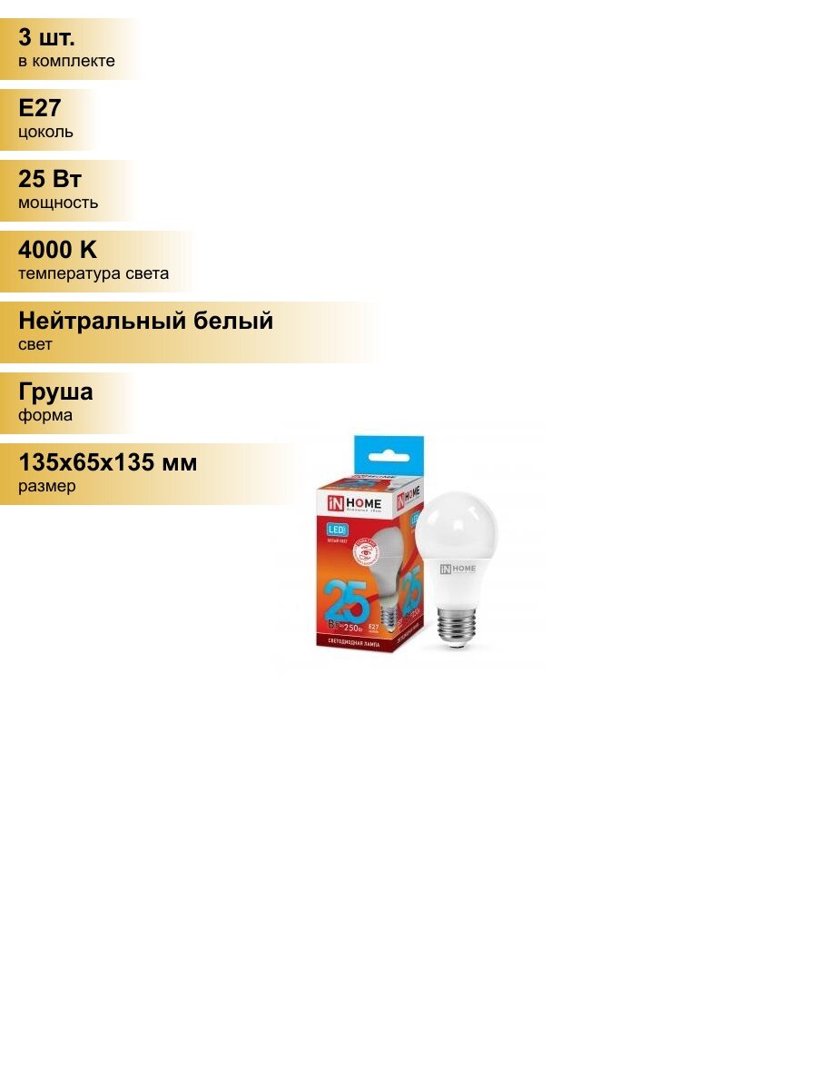 10 цен на (3 шт.) Светодиодная лампочка ASD/inHome VC ЛОН A65 E27 25W(2250lm) 4000К 4K 135x65 (без пульсации) 4080 Нейтральный белый. Цоколь E27