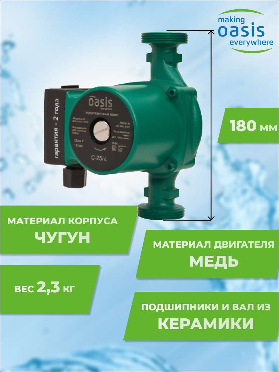 Насос циркуляционный Oasis C 25/4, для отопления, максимальный напор 4м, 72Вт, зелёный информация: