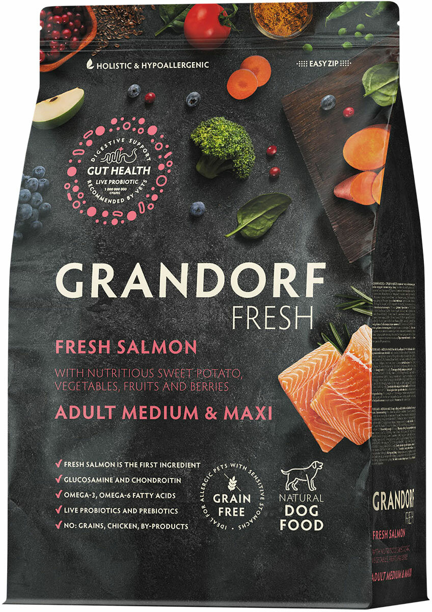 GRANDORF FRESH GF DOG ADULT MED&MAX SALMON&SWEET POTATO беззер д соб сред круп пор с лососем и батат, 1 кг информация: