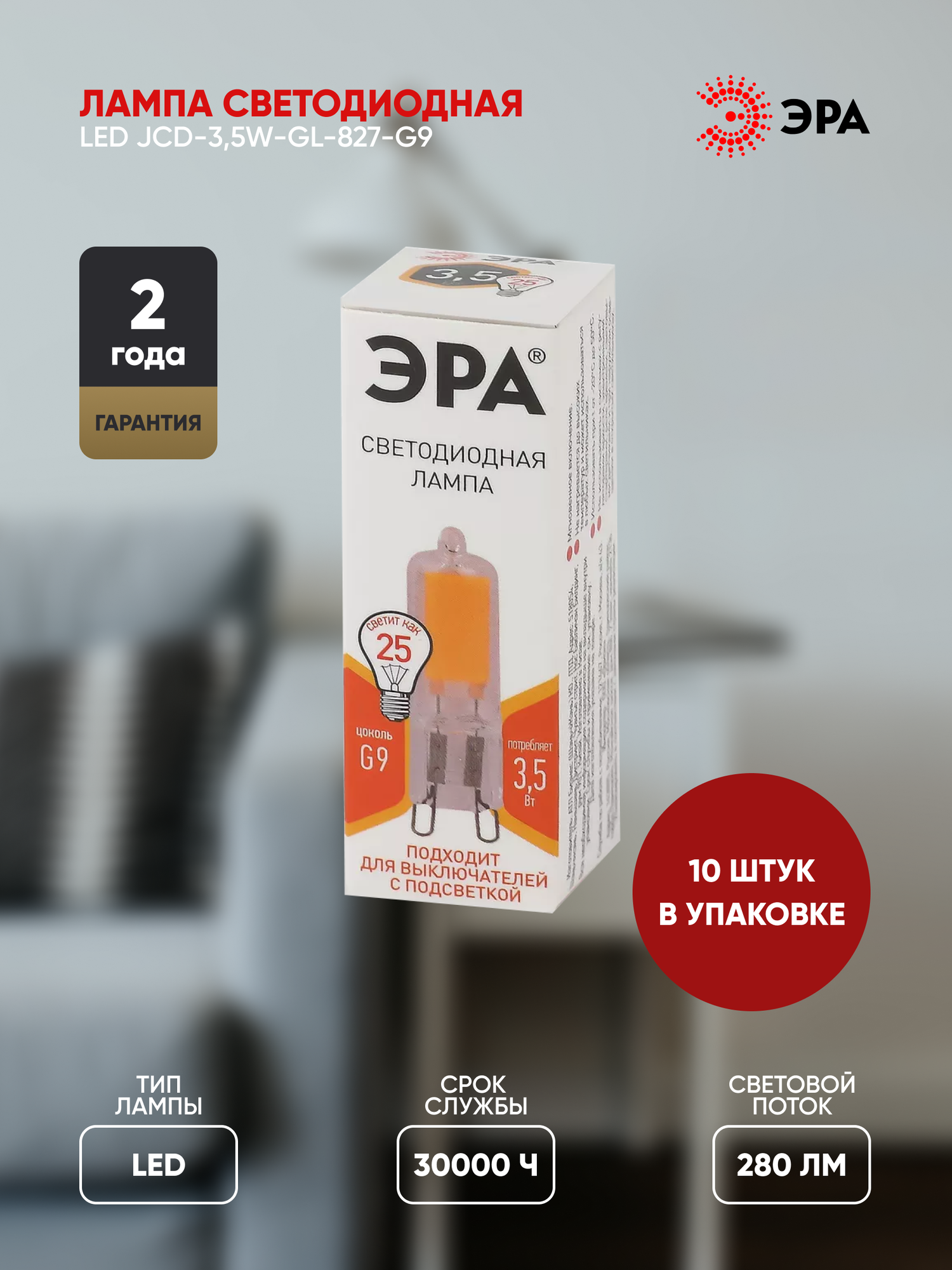 Лампочка светодиодная ЭРА (набор 10 штук) STD LED JCD-3,5W-GL-827-G9 G9 3,5ВТ капсула теплый белый свет информация: