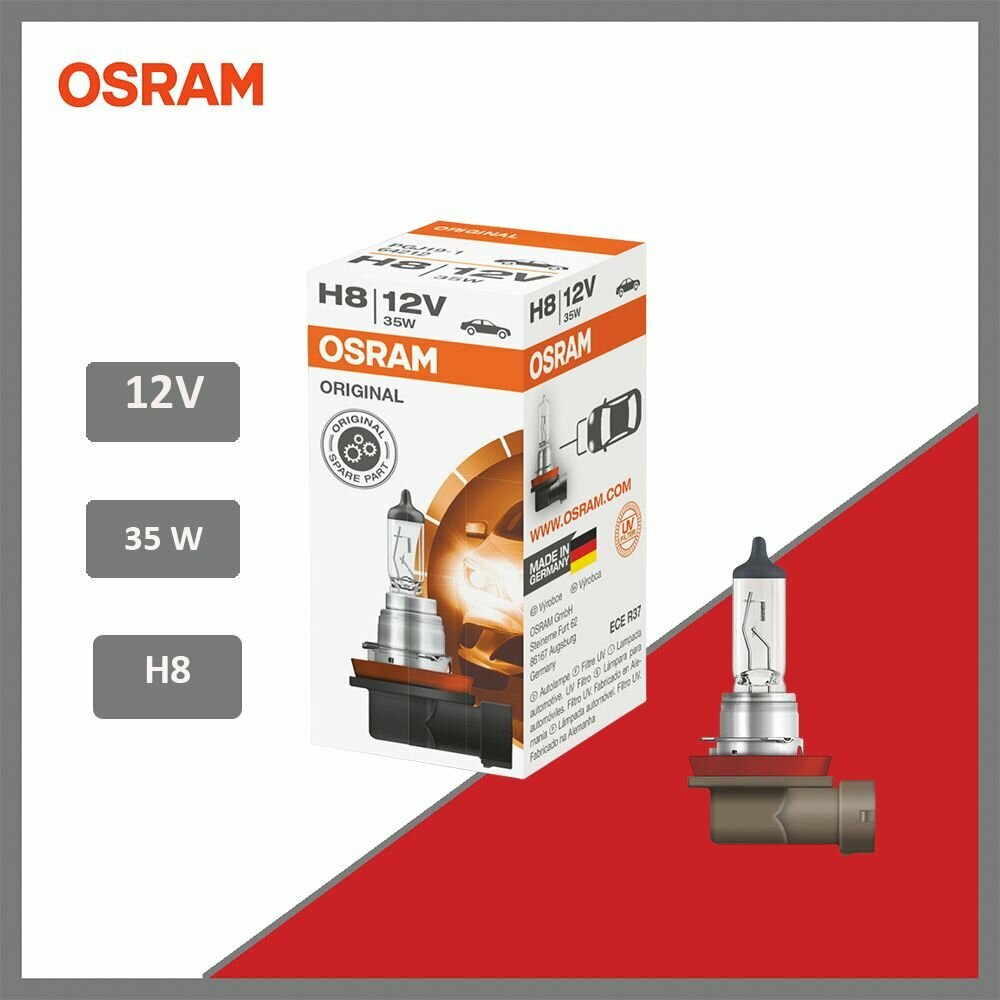 Галогенная автомобильная лампа OSRAM H8 35W 3200К тёплый белый свет 800 ч службы, 64212 информация: