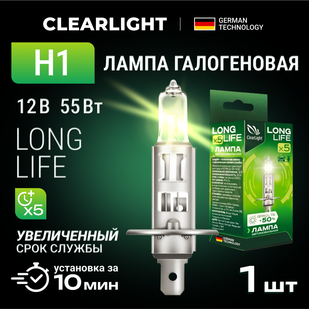 Лампа автомобильная Clearlight LongLife, H1, 12 В, 55 Вт