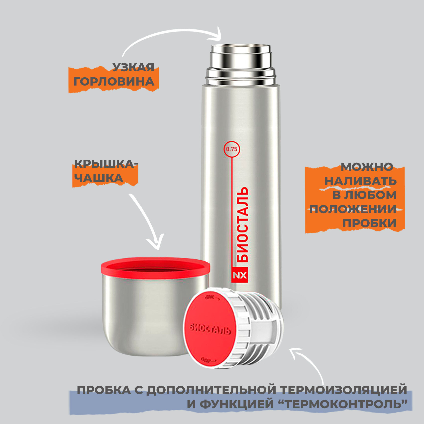 Термос классический Вакуумный с узкой горловиной, Биосталь/Biostal (0.75), NX-750 информация:
