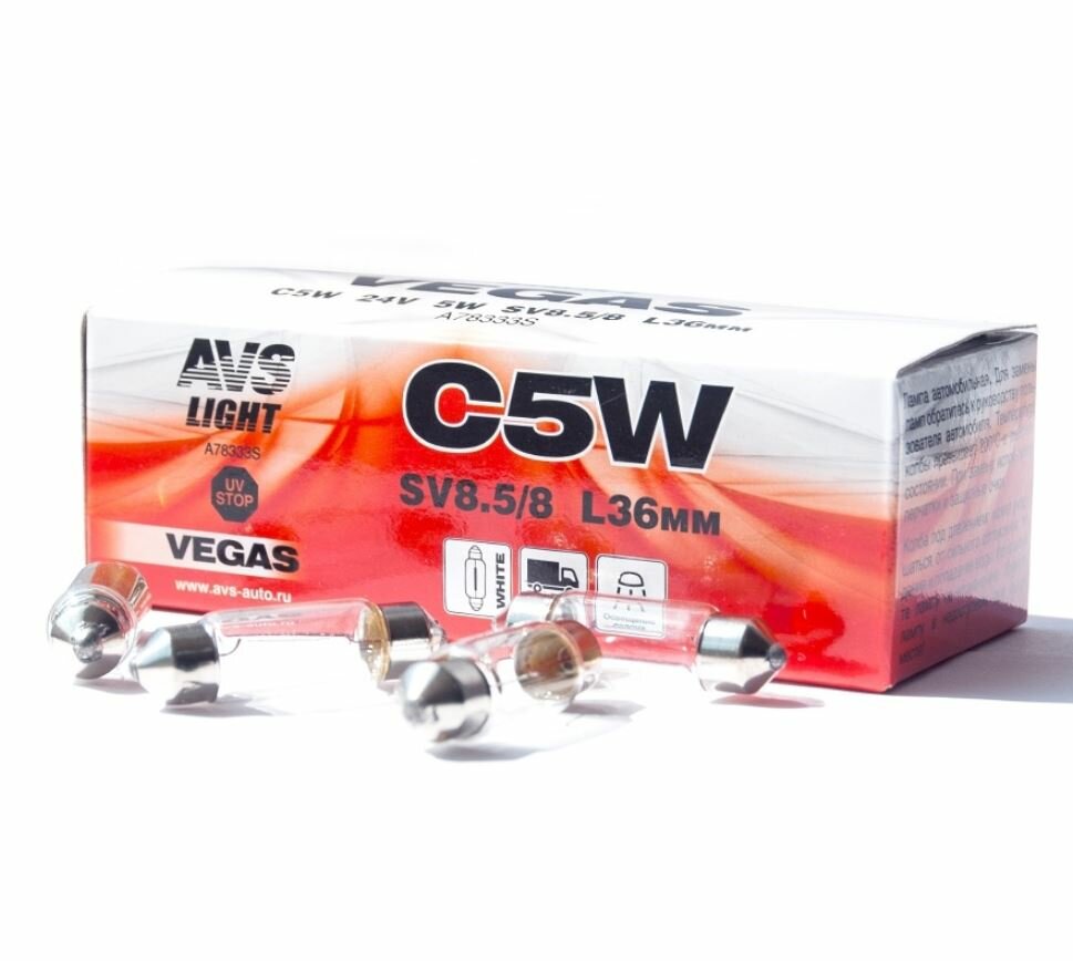 Лампа 12V С5W (SV8.5/8) L36мм. BOX(10 шт.) AVS Vegas