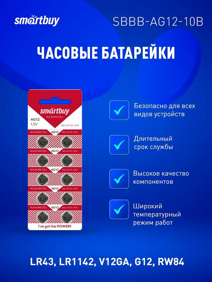 Мы выбрали 10 лучших цен на Батарейки часовые алкалиновые AG12, LR43, LR1142, V12GA, G12, RW84,10 шт. Перед тем как купить Батарейки часовые алкалиновые AG12, LR43, LR1142, V12GA, G12, RW84,10 шт посмотрите найденные предложения из Яндекс Маркета и других сайтов на основе XML фидов.