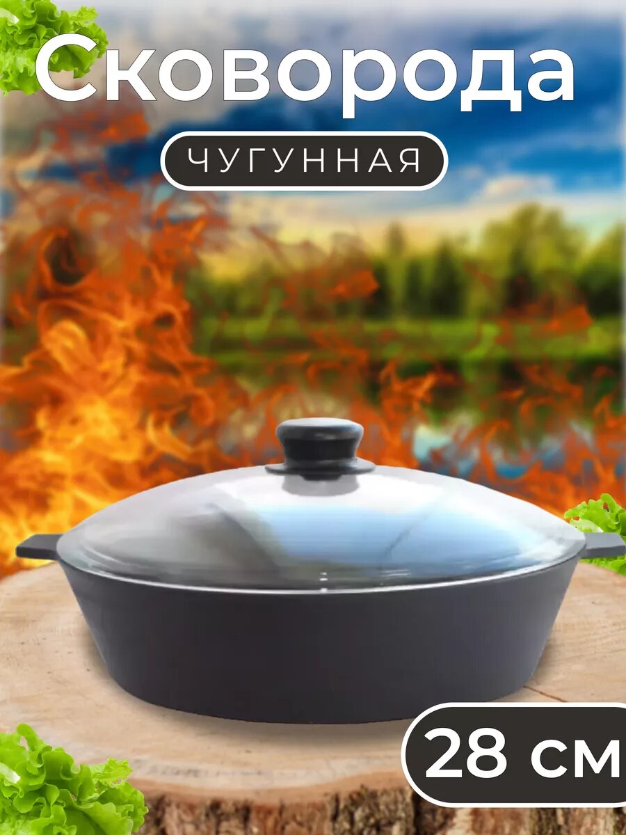Сковорода чугунная с двумя ушками стеклянная крышка 28х8 см. информация: