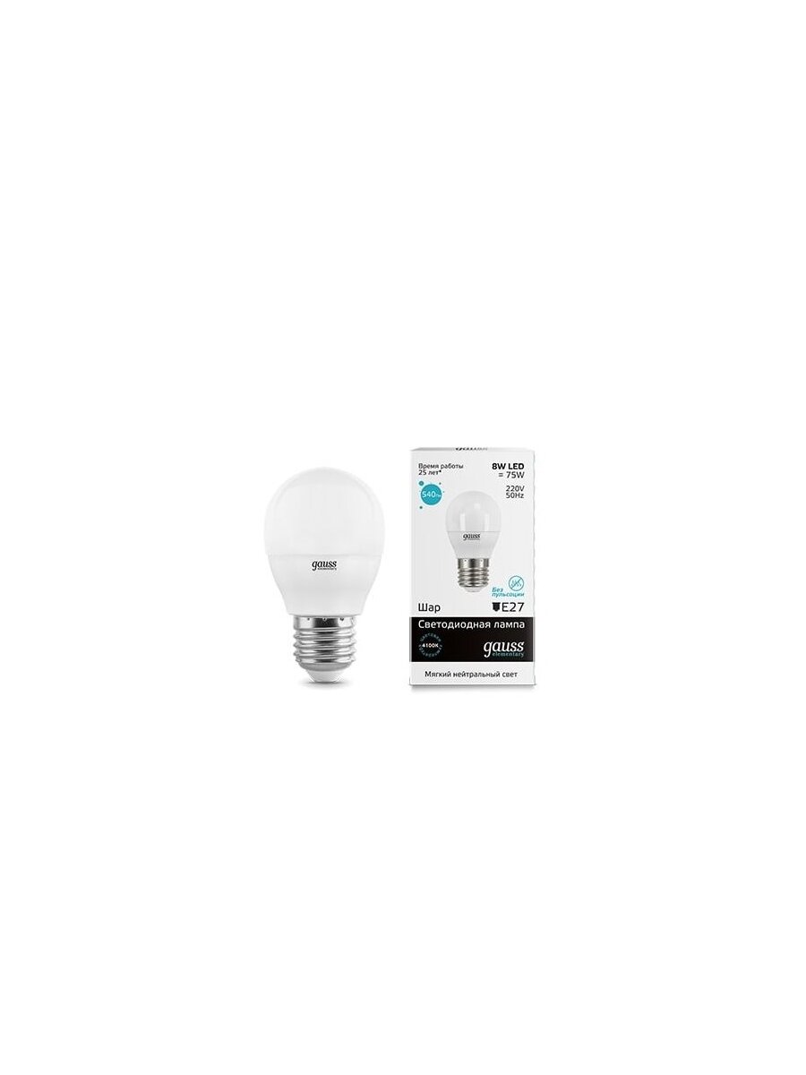 (5 шт.) Светодиодная лампочка Gauss Elementary Шар G45 E27 8W(540lm) 4100K 4K 82x45 матовая, пластик/алюм. 53228 Нейтральный белый. Цоколь E27 1 321 ₽