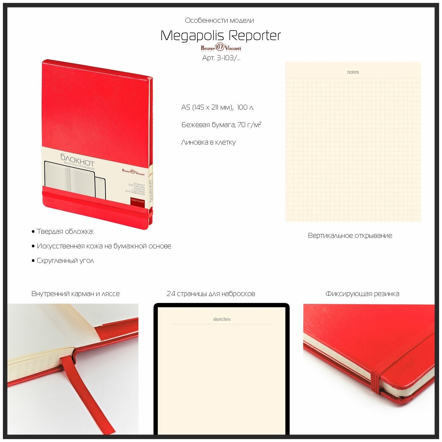 Бизнес - блокнот BrunoVisconti, А5 (144 х 212 мм), красный, 100 л, "MEGAPOLIS REPORTER", Арт. 3-103/04 информация: