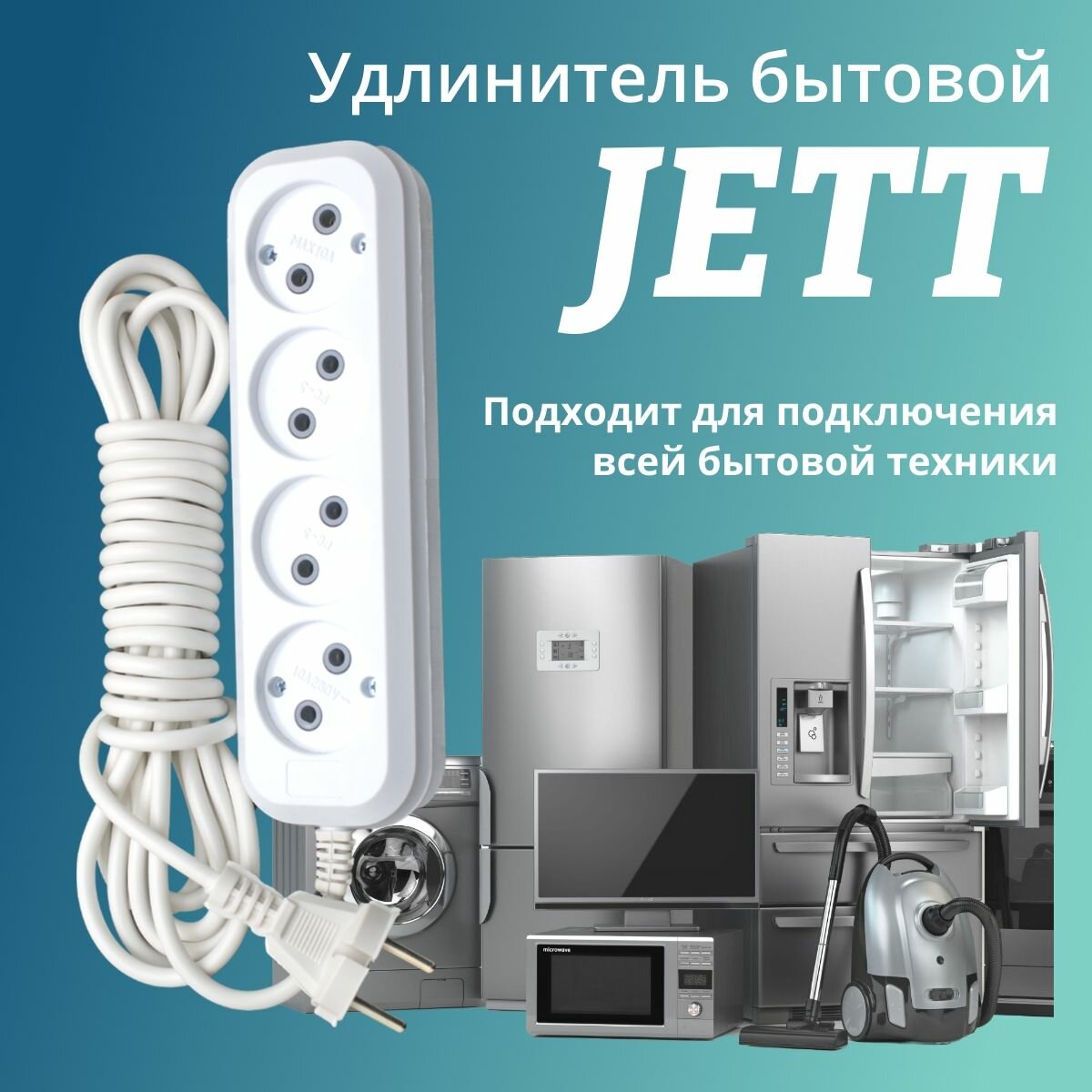 Отзывы на Сетевой электрический удлинитель 5 метров на 4 розетки без заземления JETT ( джетт) РС-4 ( ПВС ) , 2200Вт
