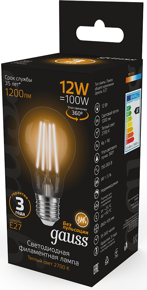 Филаментная лампочка Gauss A60 2700K (12 Вт, E27) 10шт (102902112) информация: