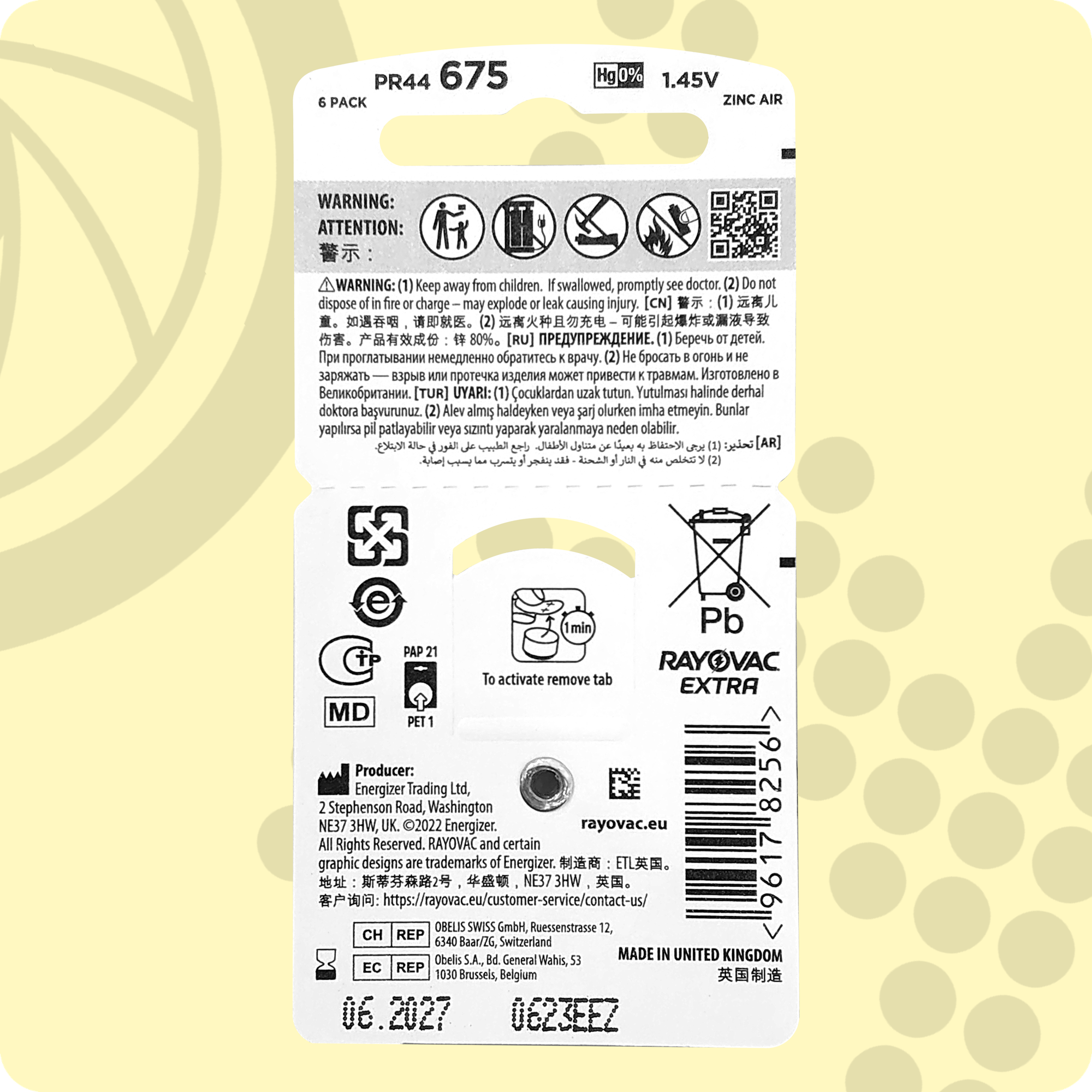 Rayovac 675 Синий (ZA675/PR44) Extra | 1,45 вольт Воздушно-цинковые Батарейки для слуховых аппаратов - 6шт. информация: