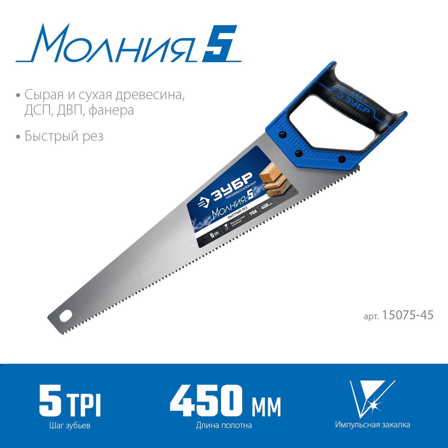 ЗУБР Молния-5 Ножовка по дереву для быстрого пиления, 450 мм 15075-45_z02