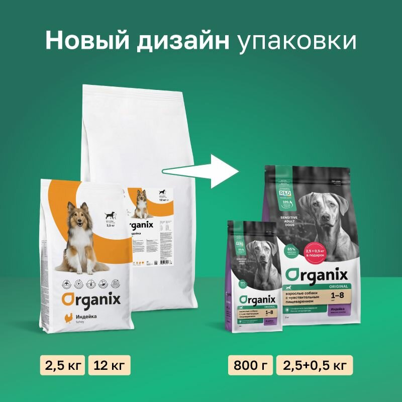 Organix сухой корм для взрослых собак всех пород с чувствительным пищеварением, с индейкой, фруктами и овощами - 2,5 кг + 0,5 кг 1 494 ₽
