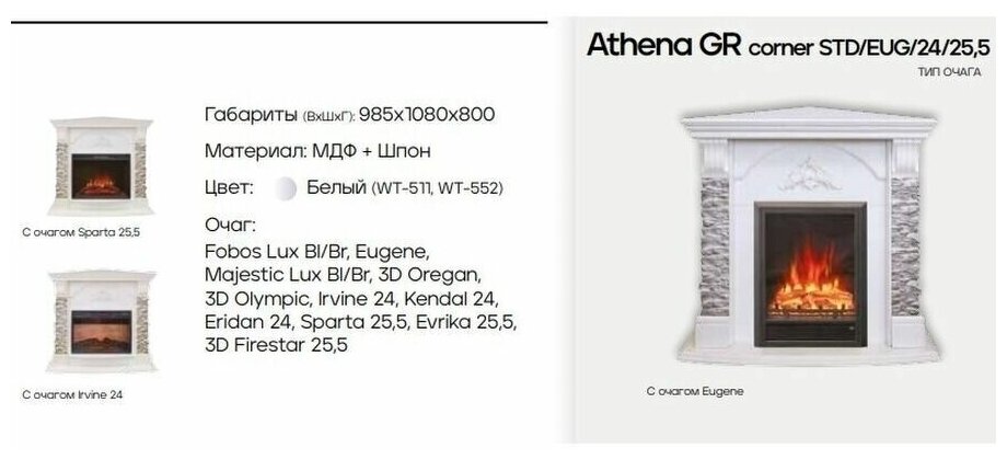 Электрокамин RealFlame Athena Corner GR WT-511 с Eugene, звуковая имитация, пульт ДУ, обогрев, имитация пламени и звука информация: