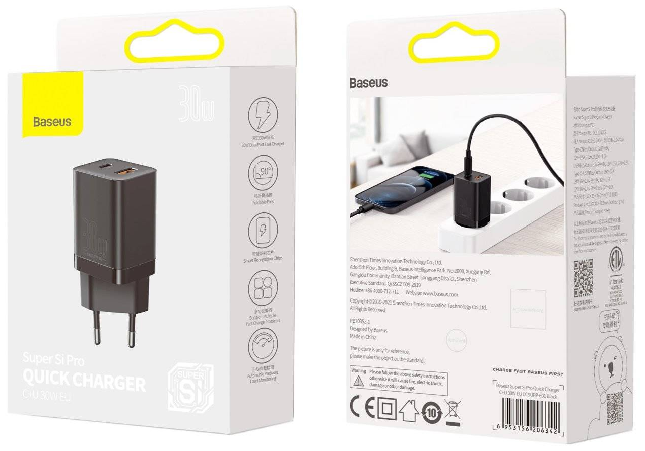 Отзывы на Сетевое зарядное устройство Baseus CCSUPP-E01 Super Si Pro Quick Charger USB-C + USB-А, 30 Вт, черный