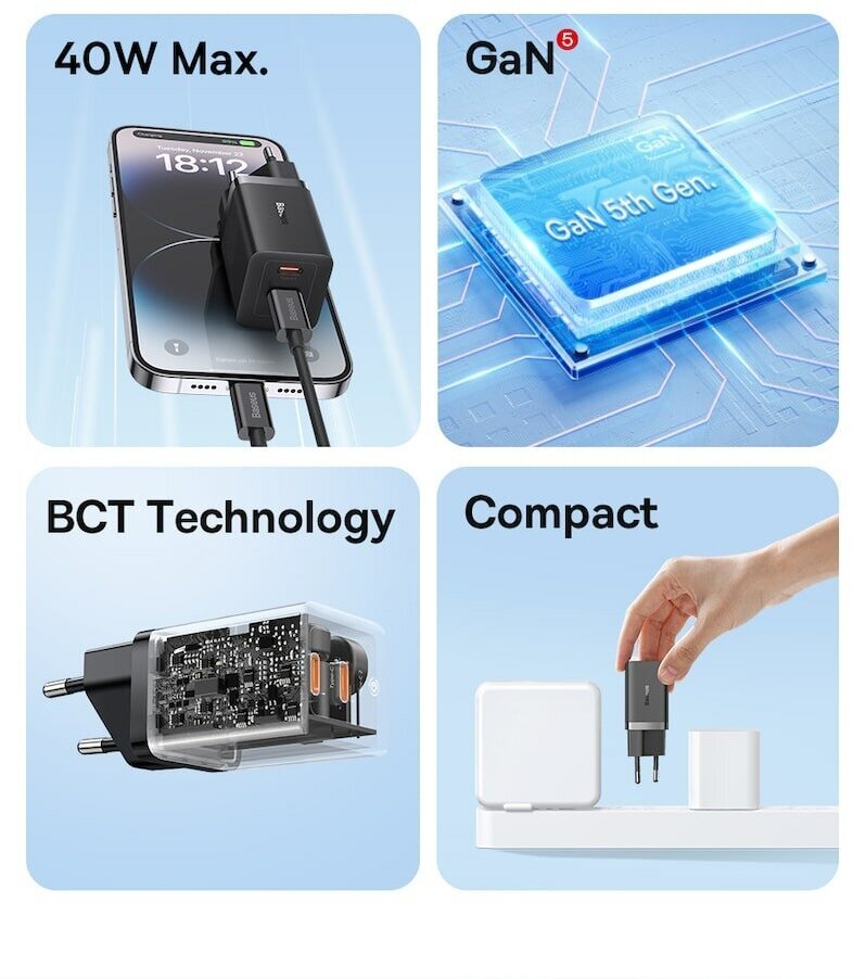 Сетевое зарядное устройство Baseus GaN5 Pro Fast Charger C+C 40W EU, CCGP180101, черный