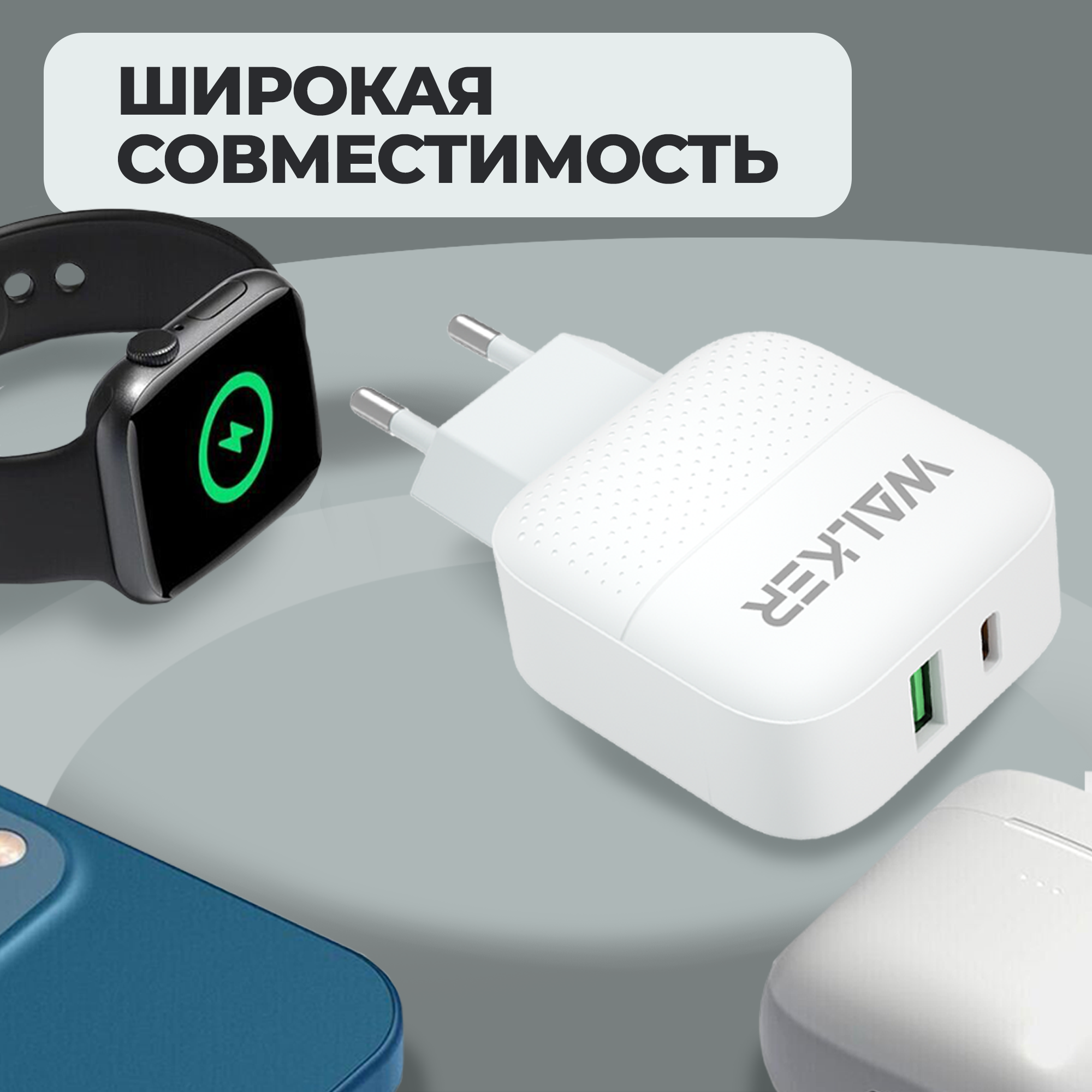 Зарядное устройство, WALKER, WH-37, 18W, разъемы USB и Type-C, зарядка type c, зарядка для айфона, адаптер питания, блок питания для телефона, белый 763 ₽