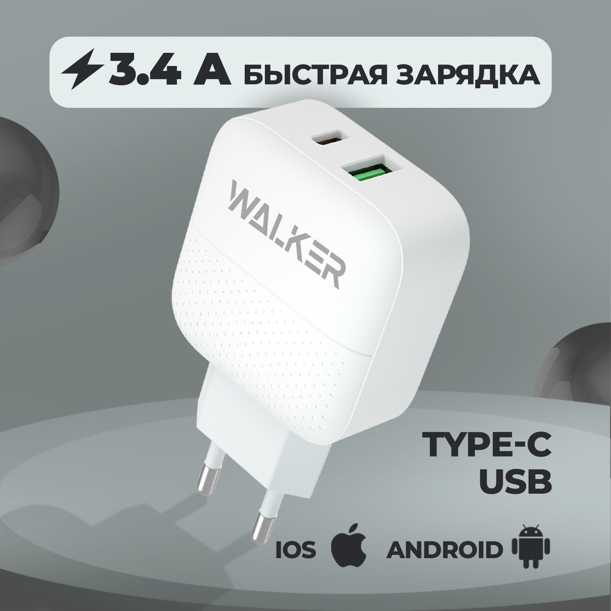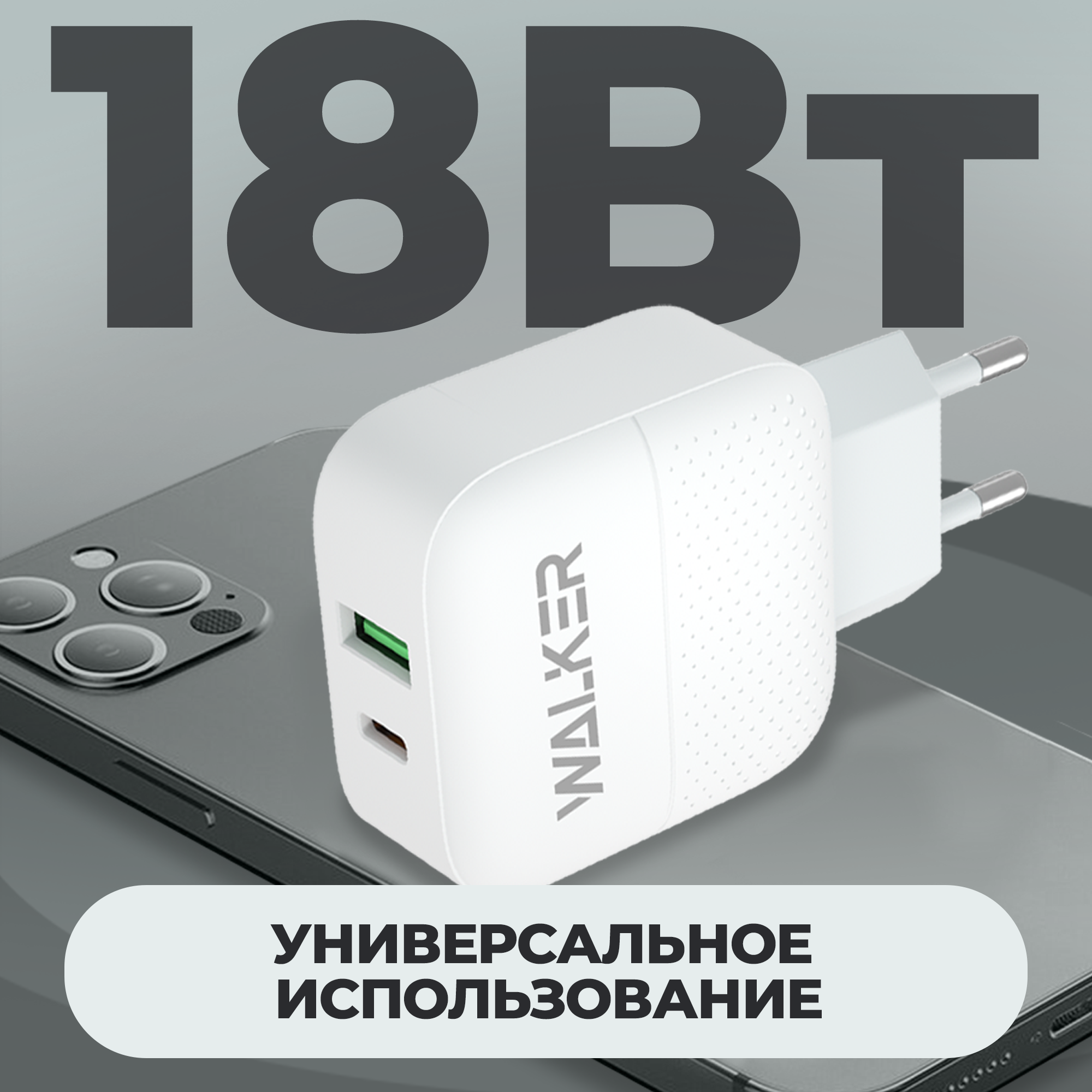 Сетевое зарядное устройство для телефона WALKER WH-37 2 разъема USB и Type-C 18W, быстрая зарядка, блок питания для xiaomi, iphone, на андроид, белый 610 ₽