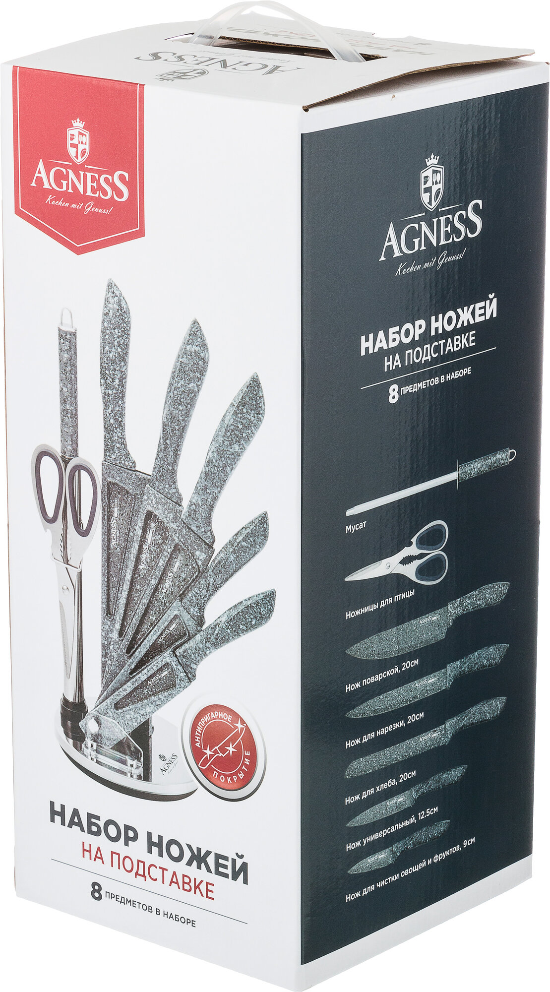 Набор ножей Agness "Монблан" с ножницами и мусатом на вращающейся платиковой подставке, 8 предметов