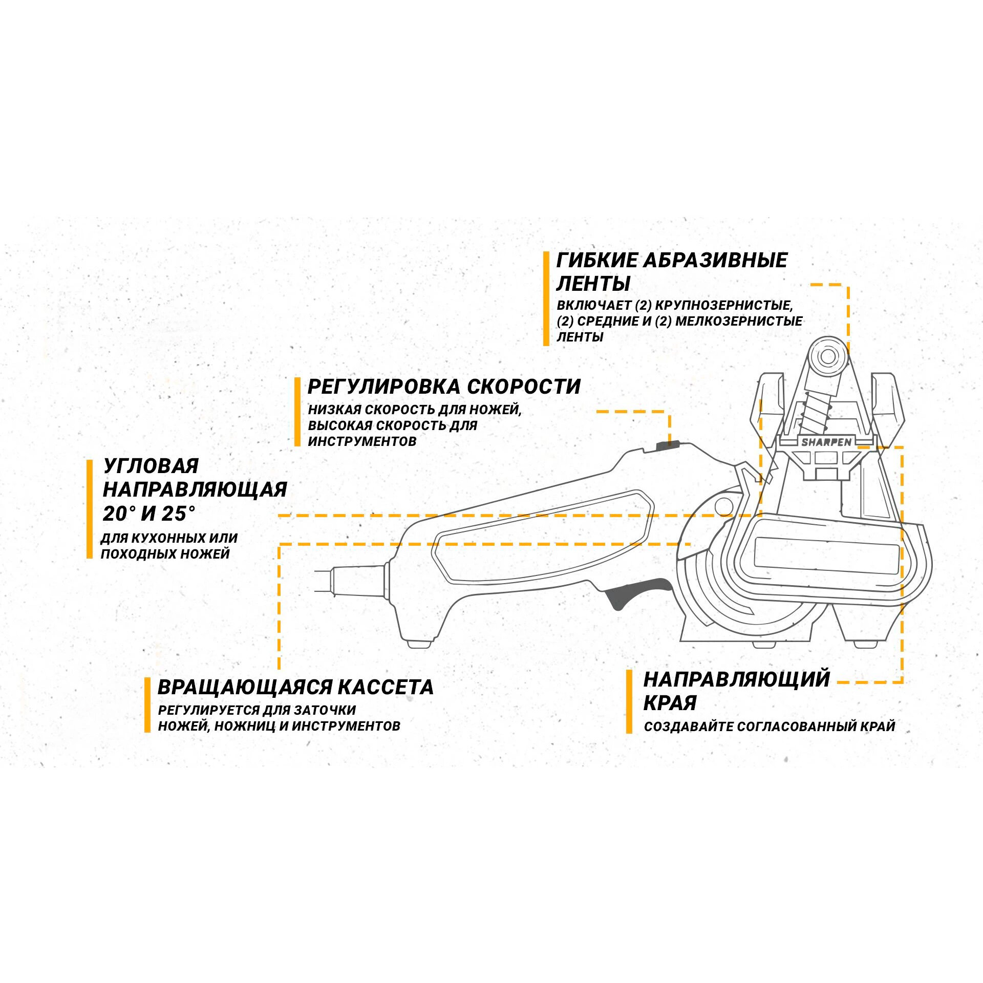 | Дополнительная информация | в комплекте абразивные ленты — 5 шт ( Extra Coarse - 120 Grit, Coarse - 220 Grit, Medium - 1000 Grit, Fine - 3000 Grit, Extra Fine - 6000 Grit) размером 1,9 см х 30,48 см; диск с видео-обзором по эксплуатации точилки на английском языке с инструкцией |