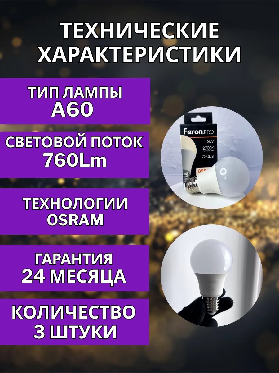 Лампа светодиодная FERON LB-1009, E27, 9W, 2700K, теплый белый свет, 3 шт 795 ₽