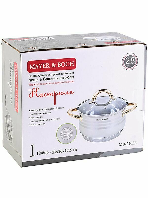Кастрюля нержавеющая сталь со стеклянной крышкой 2,8 л, для всех видов плит, в т. ч. для индукционных, Mayer&Boch информация: