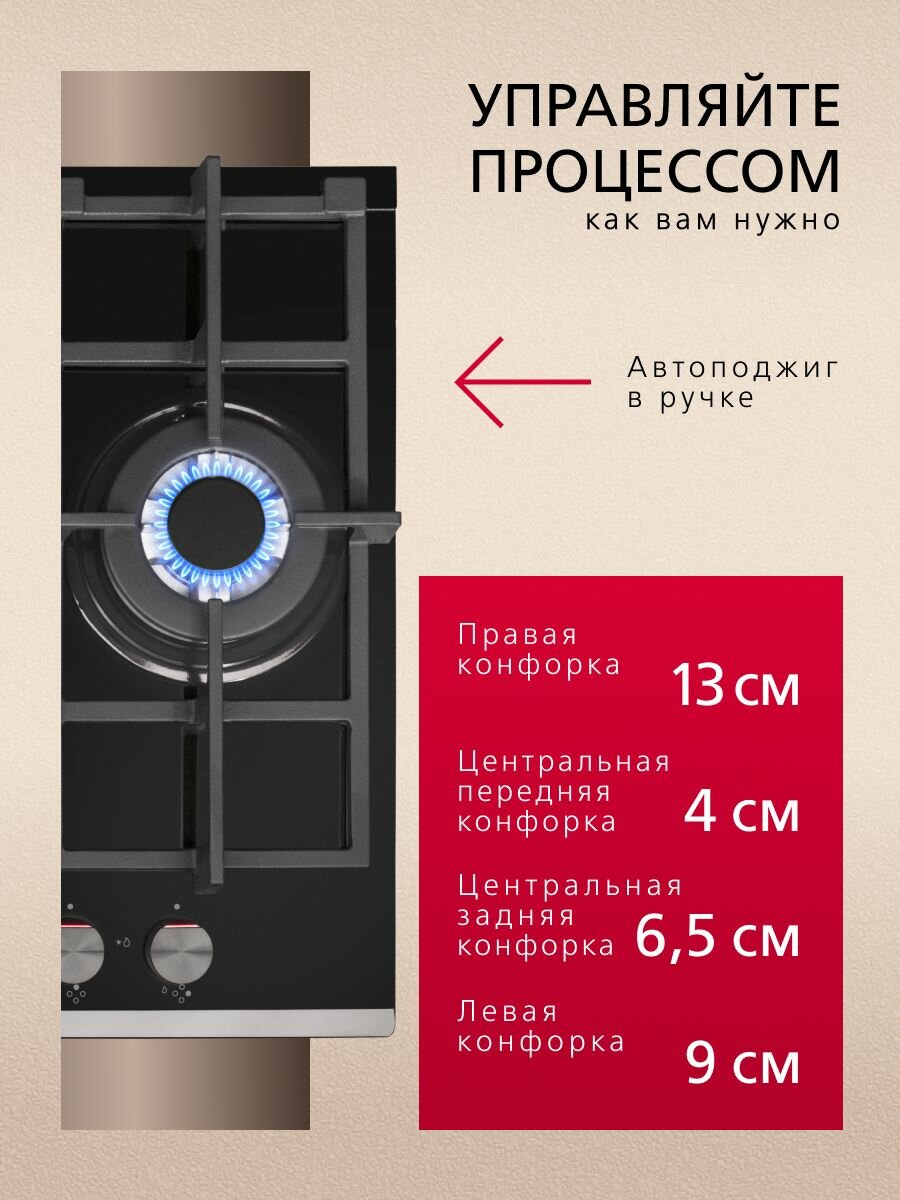 | Размеры конфорок | левая конфорка 9 см, передняя центральная конфорка 4 см, задняя центральная конфорка 6.5 см, правая конфорка 13 см |