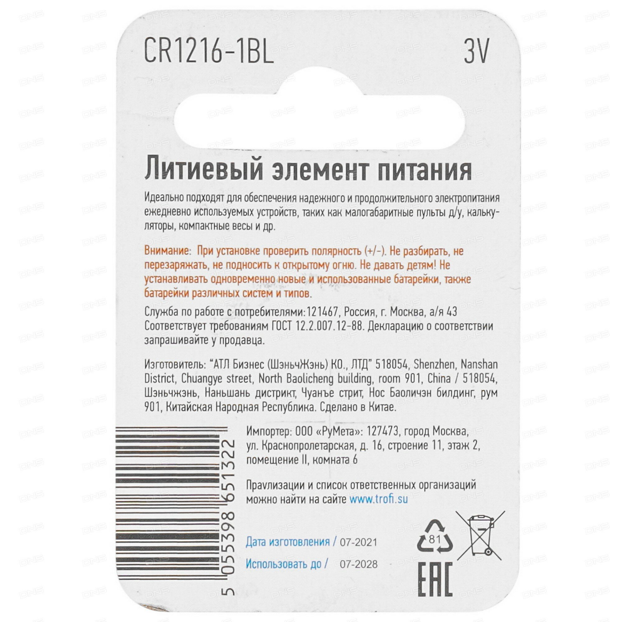 Элемент питания литиевый CR1216-1BL (блист. 1шт) Б0003642 Трофи