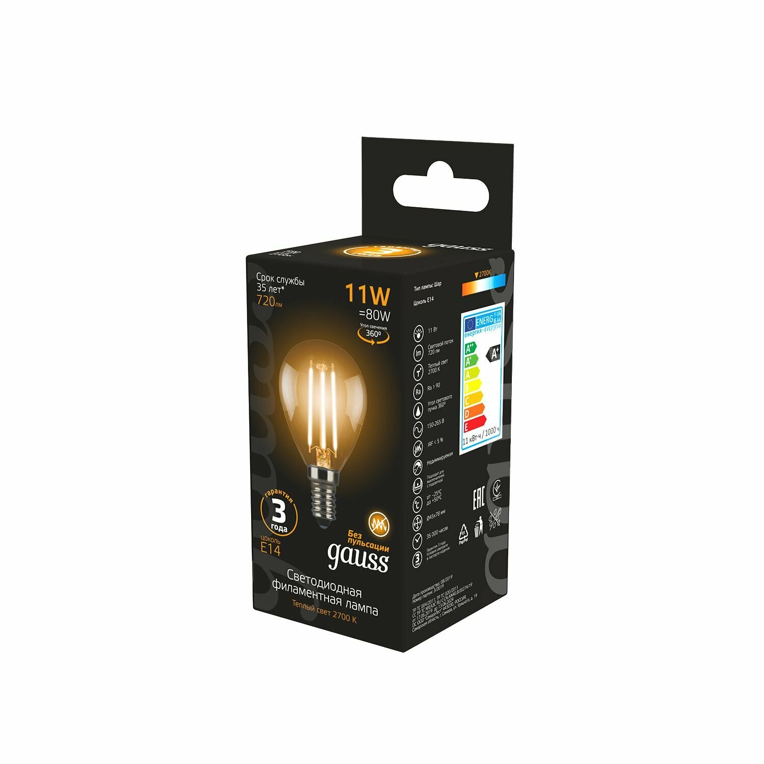 Лампа светодиодная Gauss Filament Шар E14 11Вт 720lm 2700K (105801111) 10шт информация: