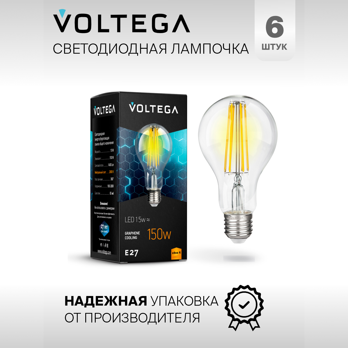 Отзывы на Лампочка светодиодная E27 форма груши 15W теплый свет Voltega Crystal Graphene A60 2800K упаковка 6 шт.