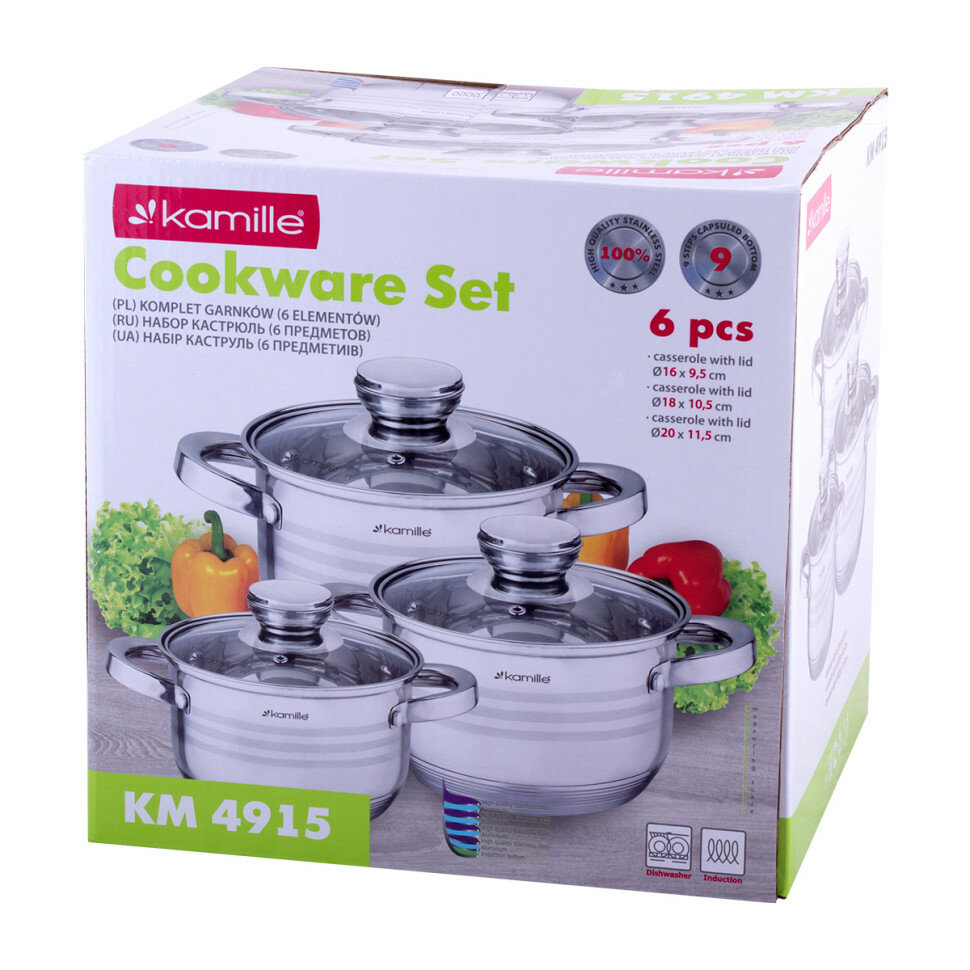Набор кастрюль 6 предметов 1,5 л; 2 л; 3 л. Kamille KM 4915 из нержавеющей стали (серебристый)