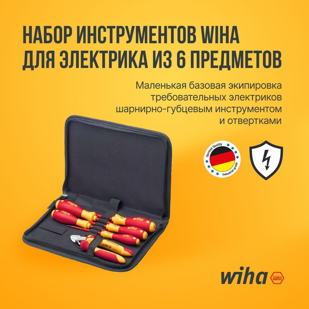 10 цен на Набор отверток электрика и бокорез Wiha 33969, 6 предметов в сумке-папке