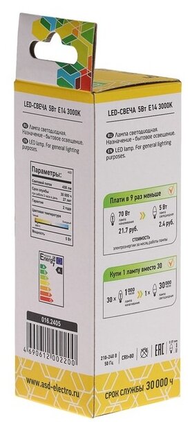 Лампа светодиодная ASD LED-СВЕЧА-STD 3000K, E14, C37, 5 Вт, 3000 К