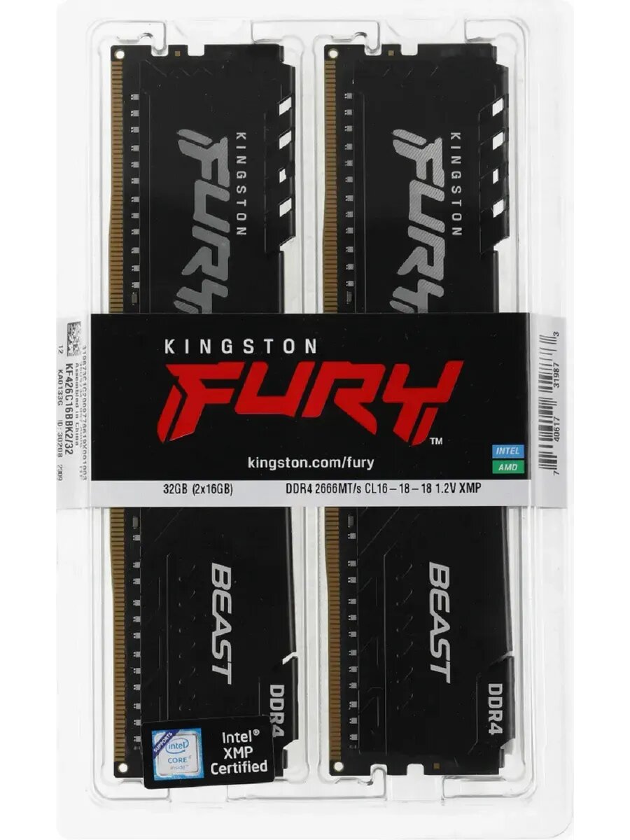 Оперативная память Kingston Fury Beast Black KF426C16BBK2/16 DDR4 - 2x 8ГБ 2666, DIMM, Ret 3 990 ₽