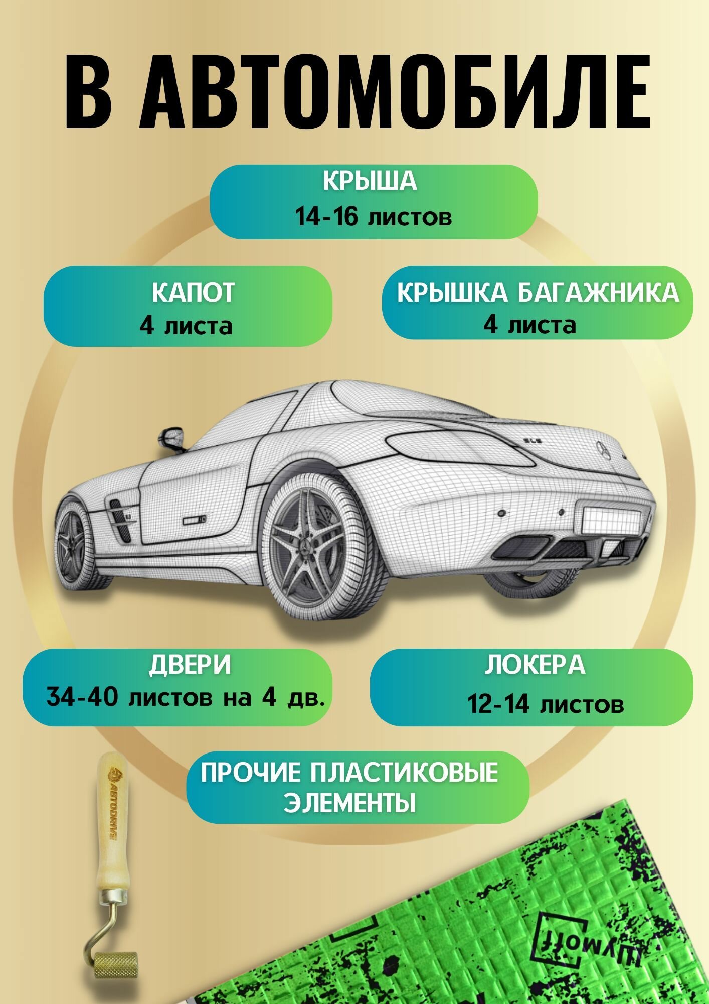 | Место применения | для пола / шумоизоляция / для капота / для багажника / для дверей / для потолка / для арок |