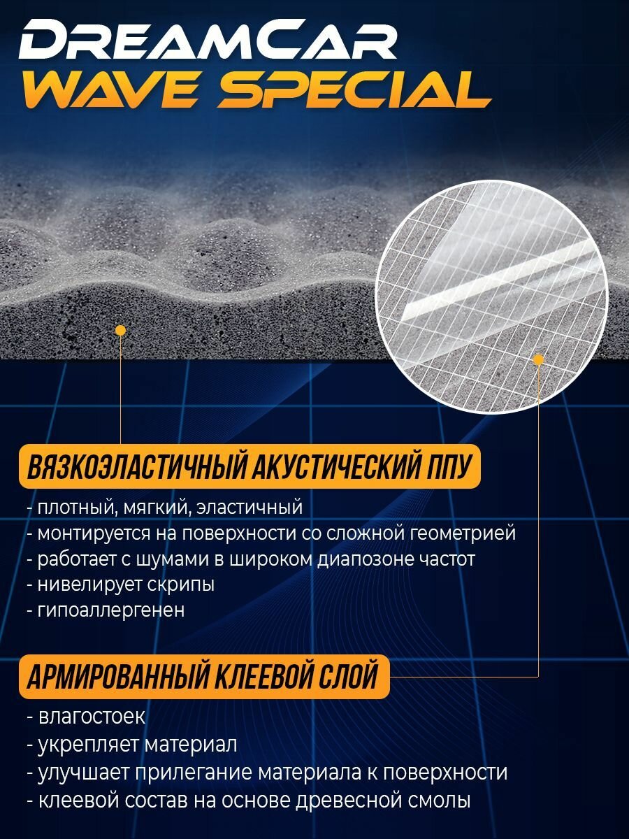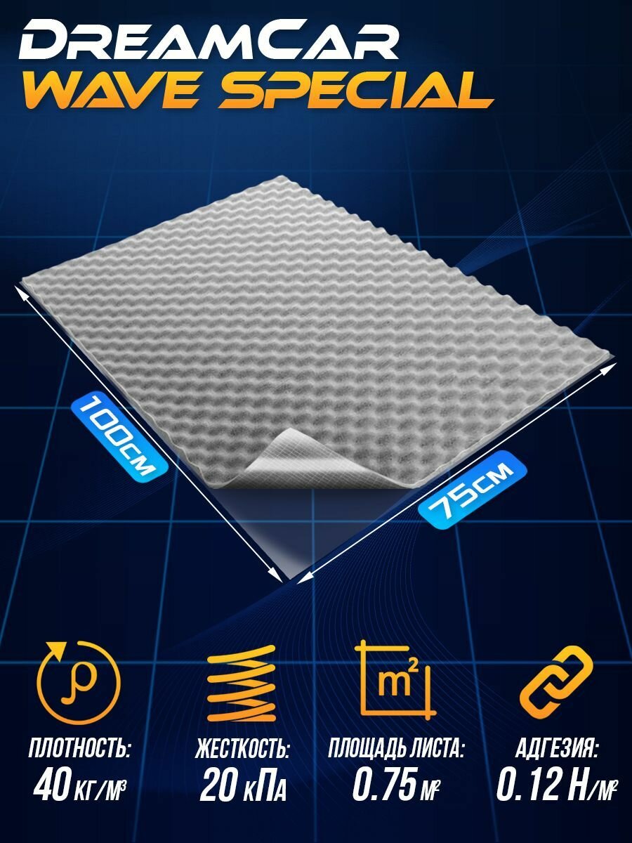 Шумоизоляция DreamCar Волна Спешэл 20, 1 лист 100*75 см, вязкоэластичный акустический поролон самоклеящийся, Wave Special информация: