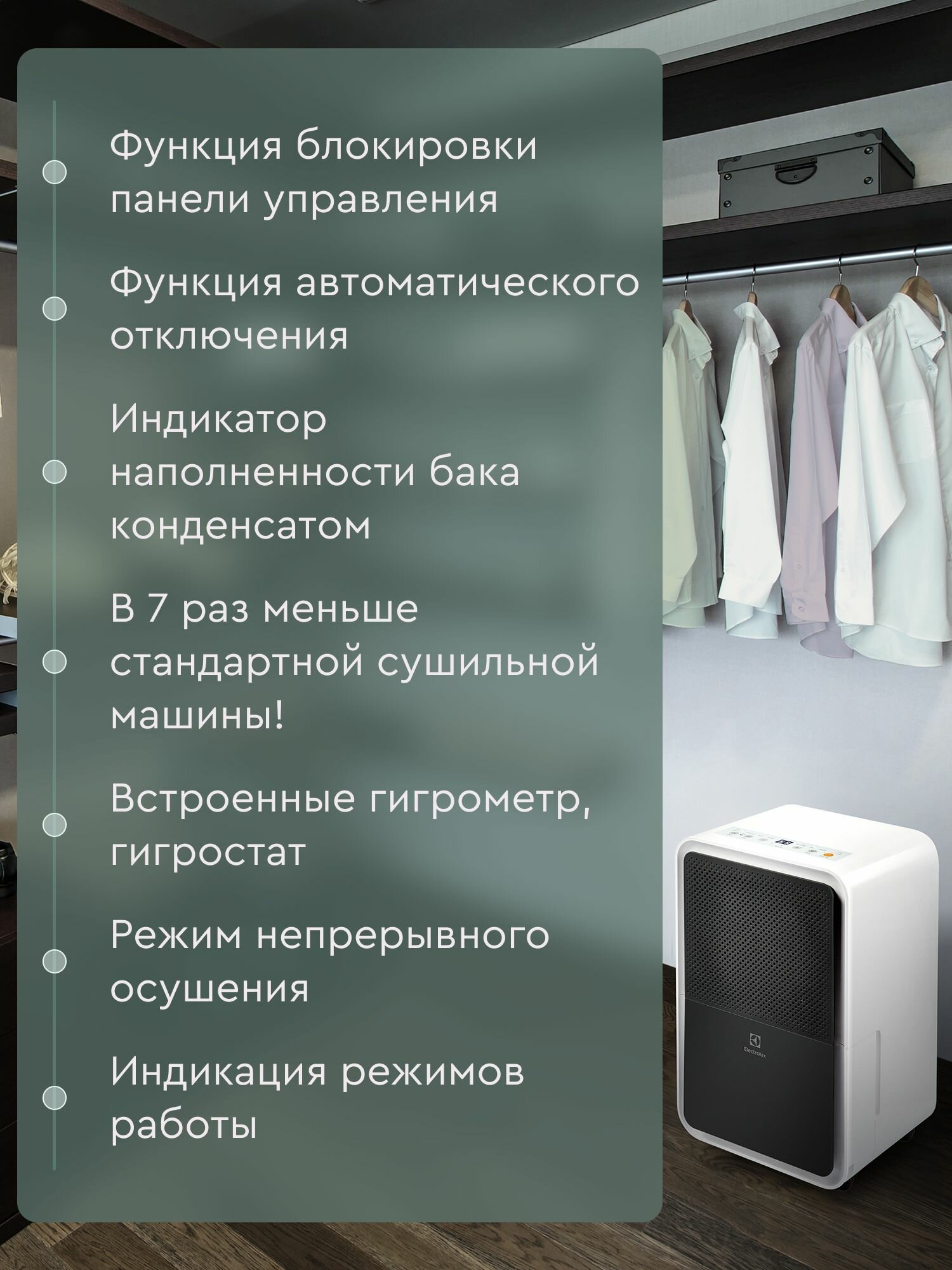 | Особенности | встроенный гигростат / дисплей / колёса |