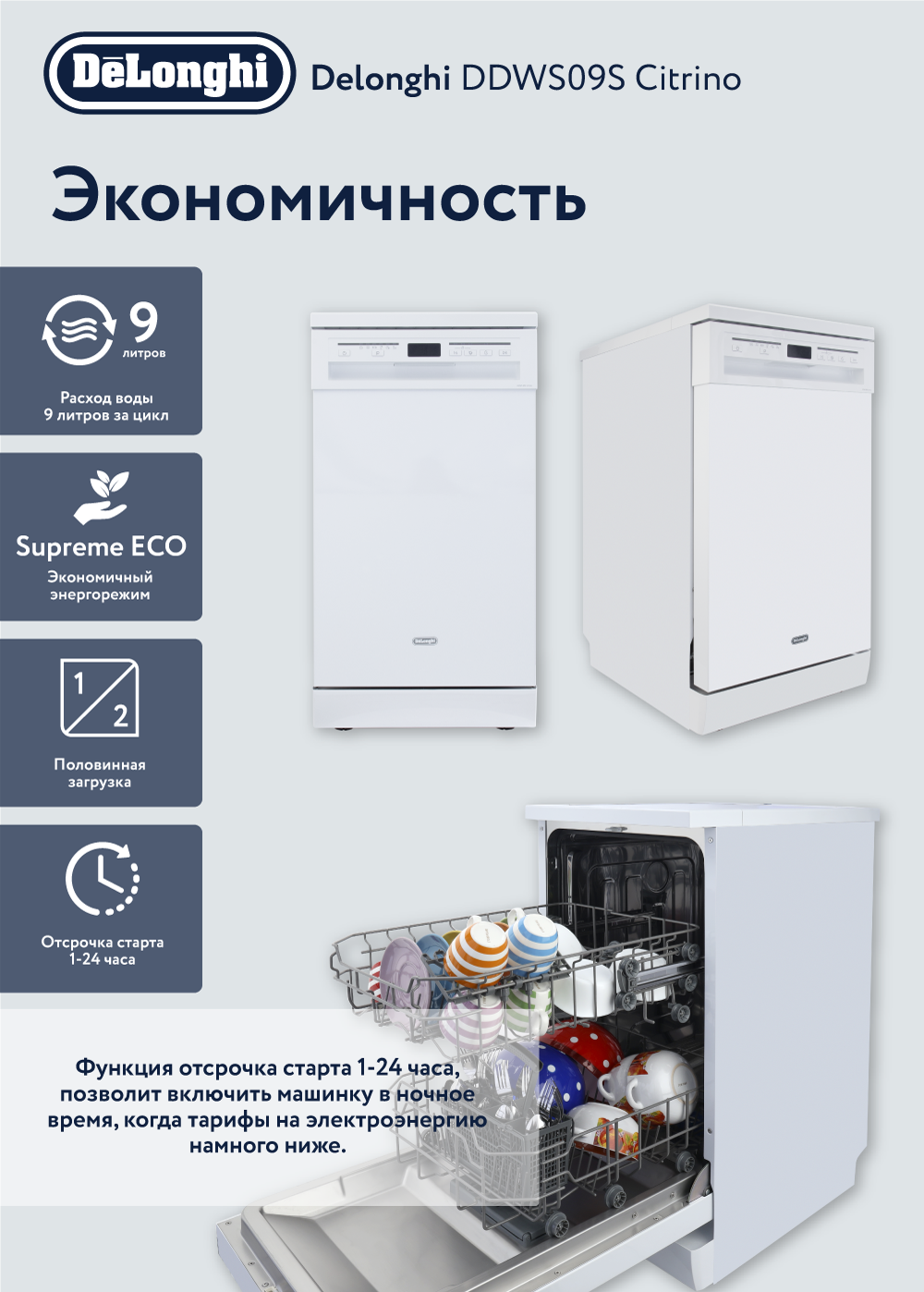 Отзывы на Отдельностоящая посудомоечная машина 45 см DeLonghi DDWS 09S Citrino, Aqua Stop, 9 комплектов, половинная загрузка, посудомойка отдельностоящая 45 см