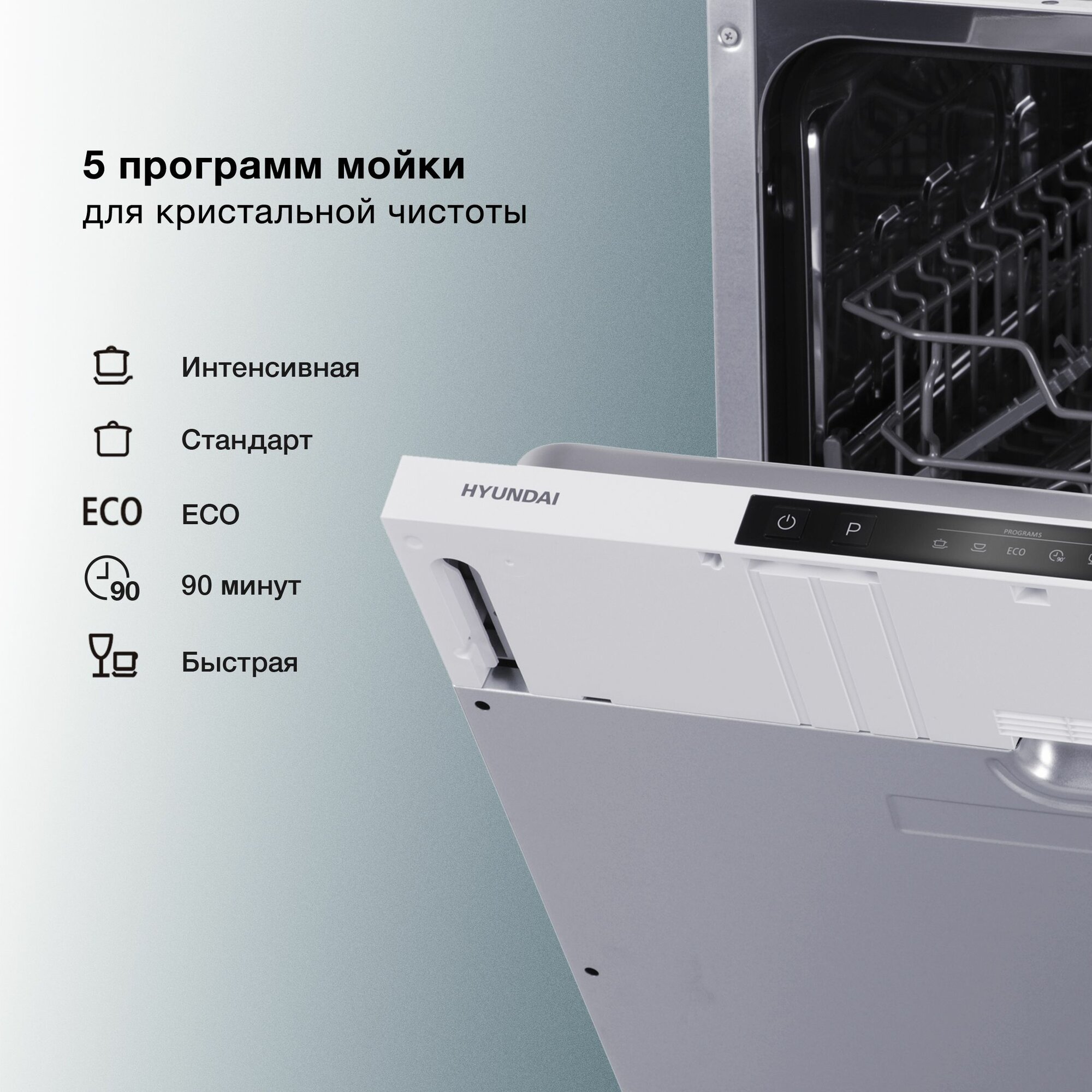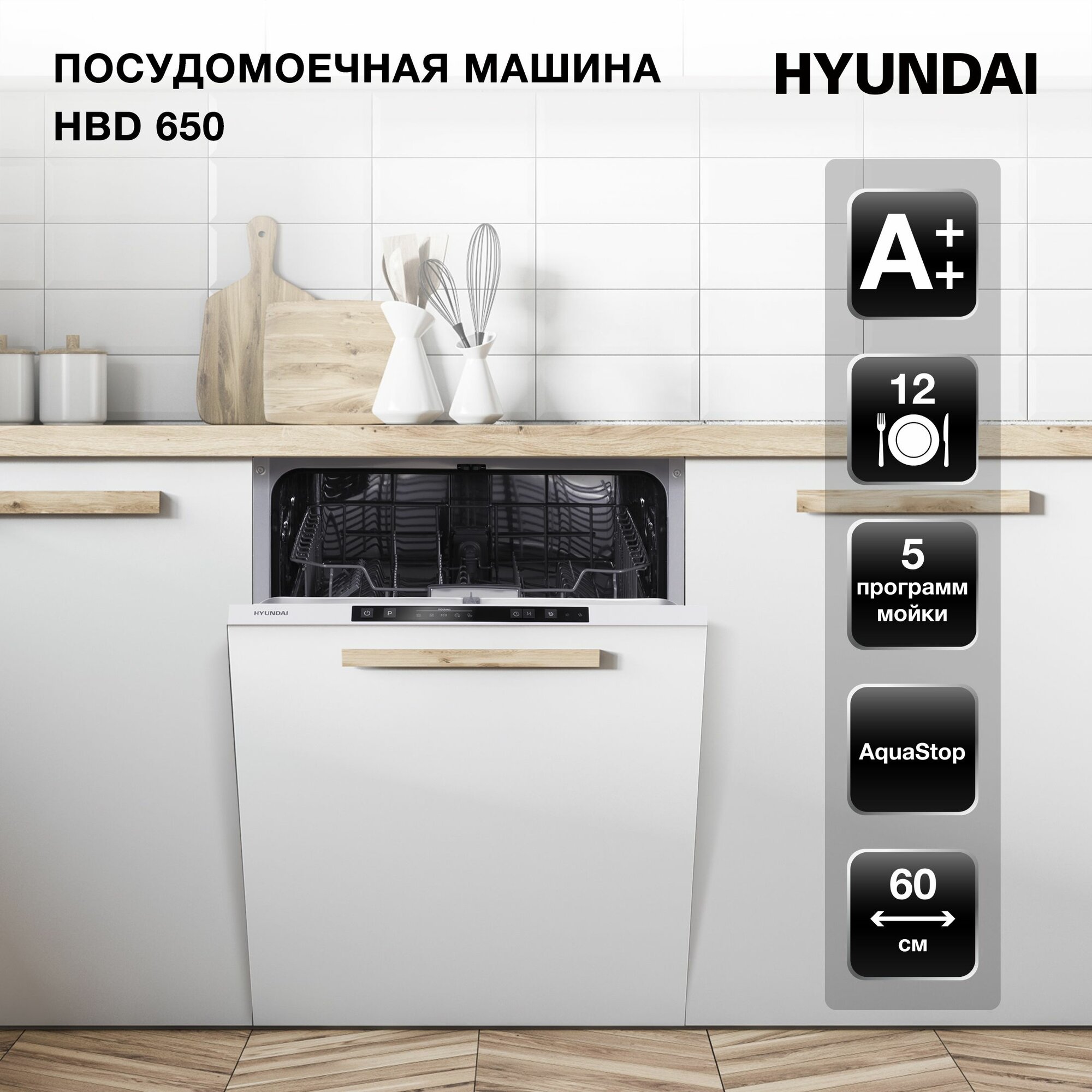 Встраиваемая посудомоечная машина Hyundai HBD 650, полноразмерная, ширина 59.8см, полновстраиваемая, загрузка 12 комплектов