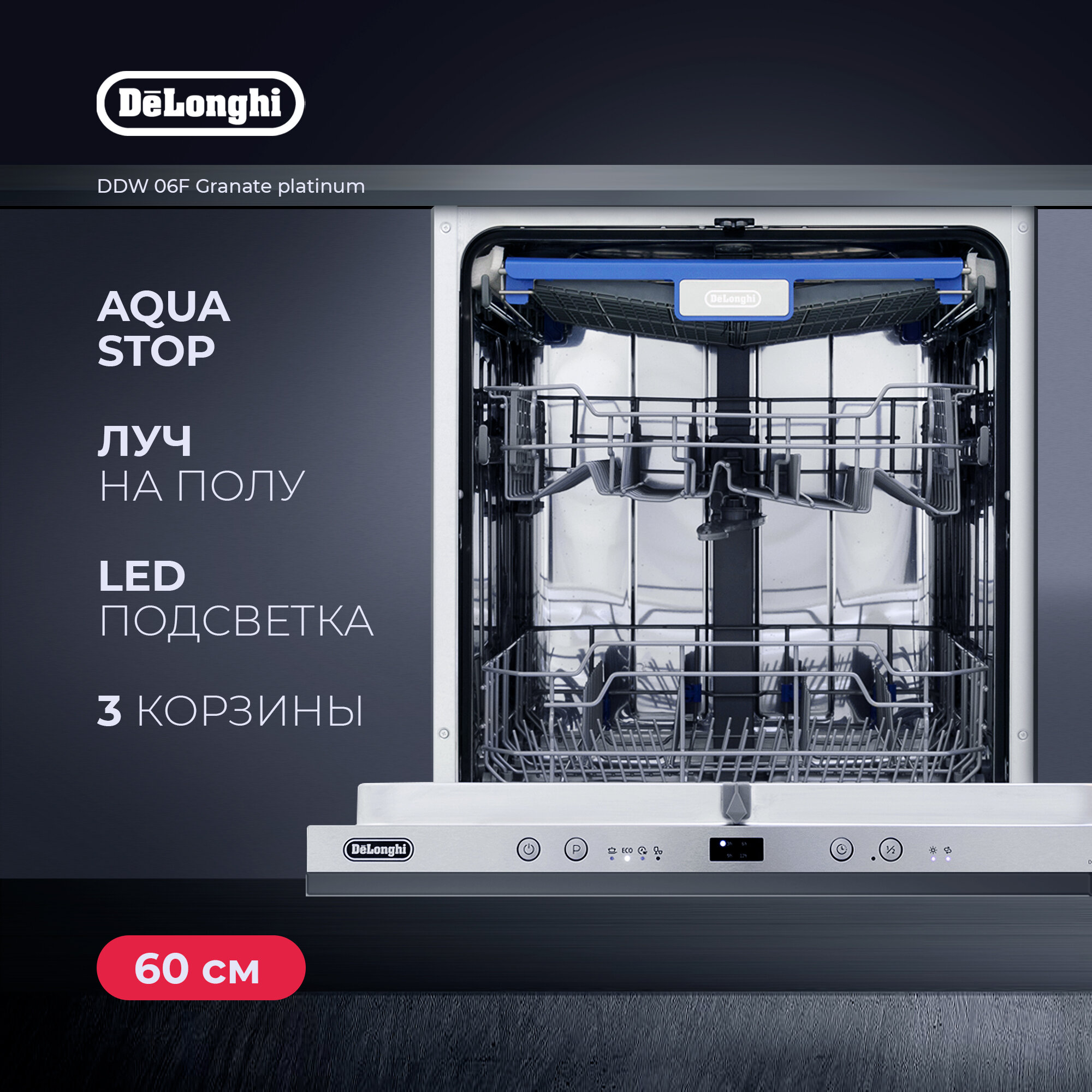 Встраиваемая посудомоечная машина 60 см DeLonghi DDW 06F Granate platinum, 14 комплектов, 3 корзины, внутренняя LED-подсветка, 60см информация: