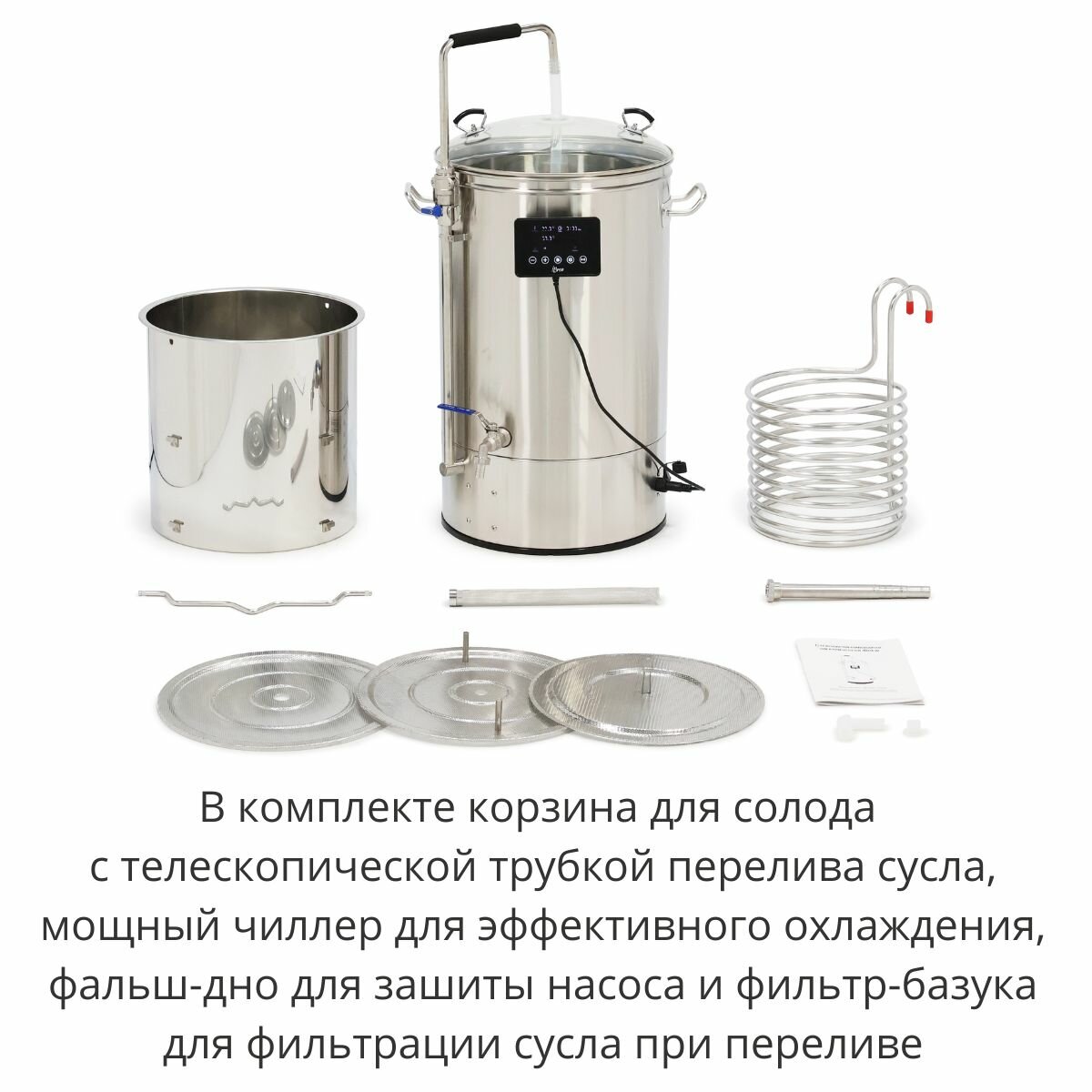 | Дополнительная информация | варочная ёмкость с краном и встроенным насосом, металлическая трубка излива для циркуляции сусла, корзина для солода (бункер с трубкой, 2 перфорированных сита), фильтр «базука», функция сохранения рецептов в памяти, автоматический и ручной режимы работы, чиллер из нержавеющей трубки (диаметр - 9,5 мм, длина - 8,8 м), цифровой контроллер с дисплеем |